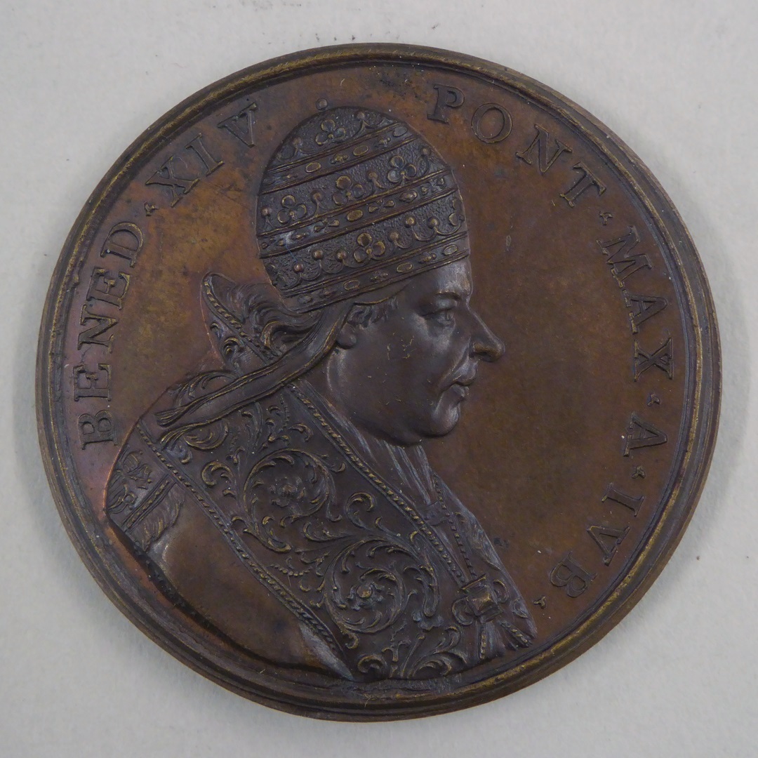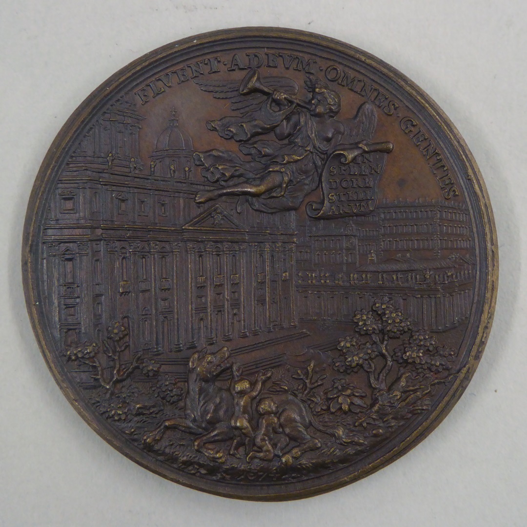 Pauspenning met portret paus Benedictus XIV (1740-1758), kz. Fama boven St. Pieterskerk, 1674