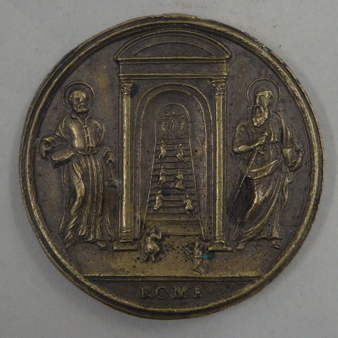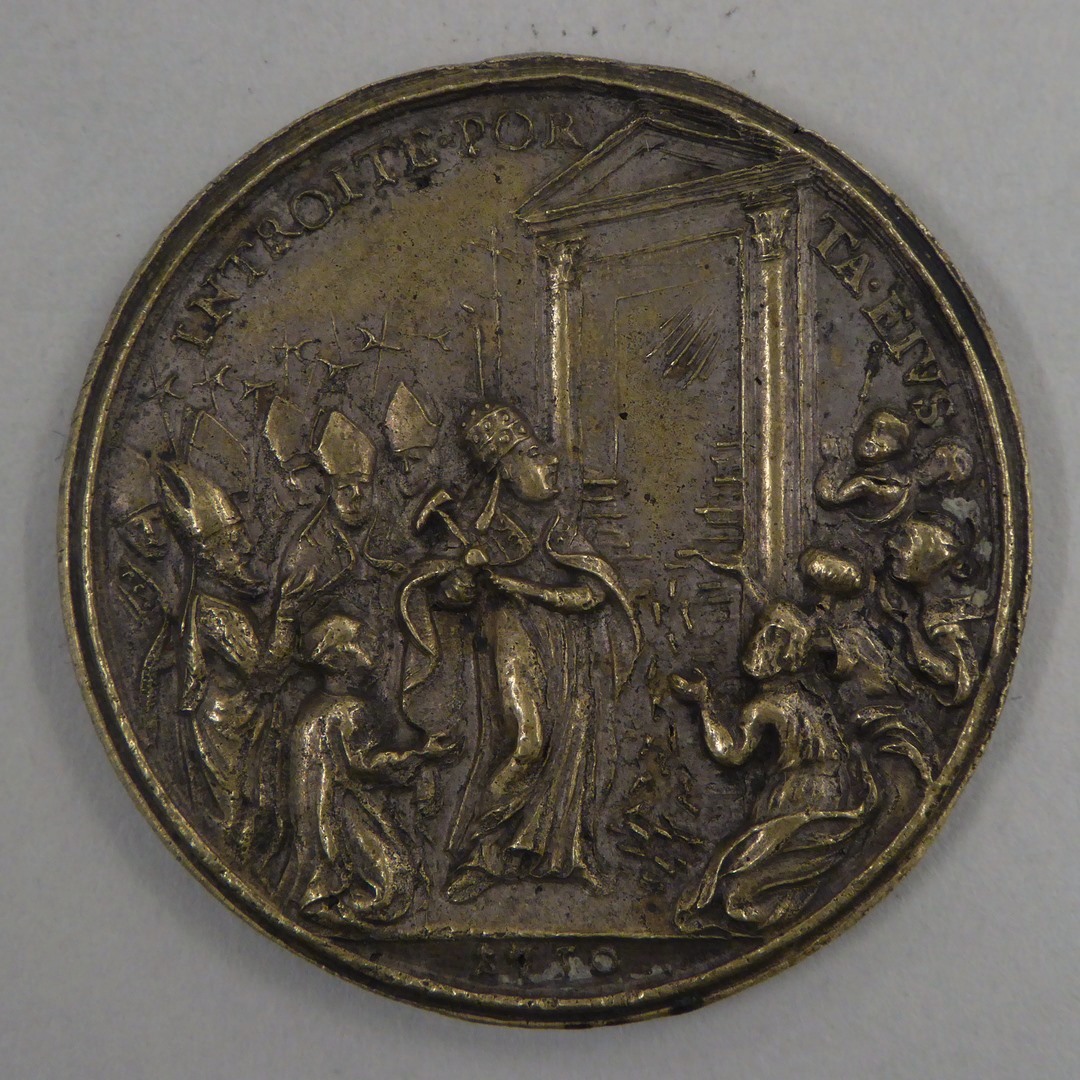 Pauspenning Benedictus XIV (1740-1758) met portiek met trap en heiligen, kz. openen H. deur