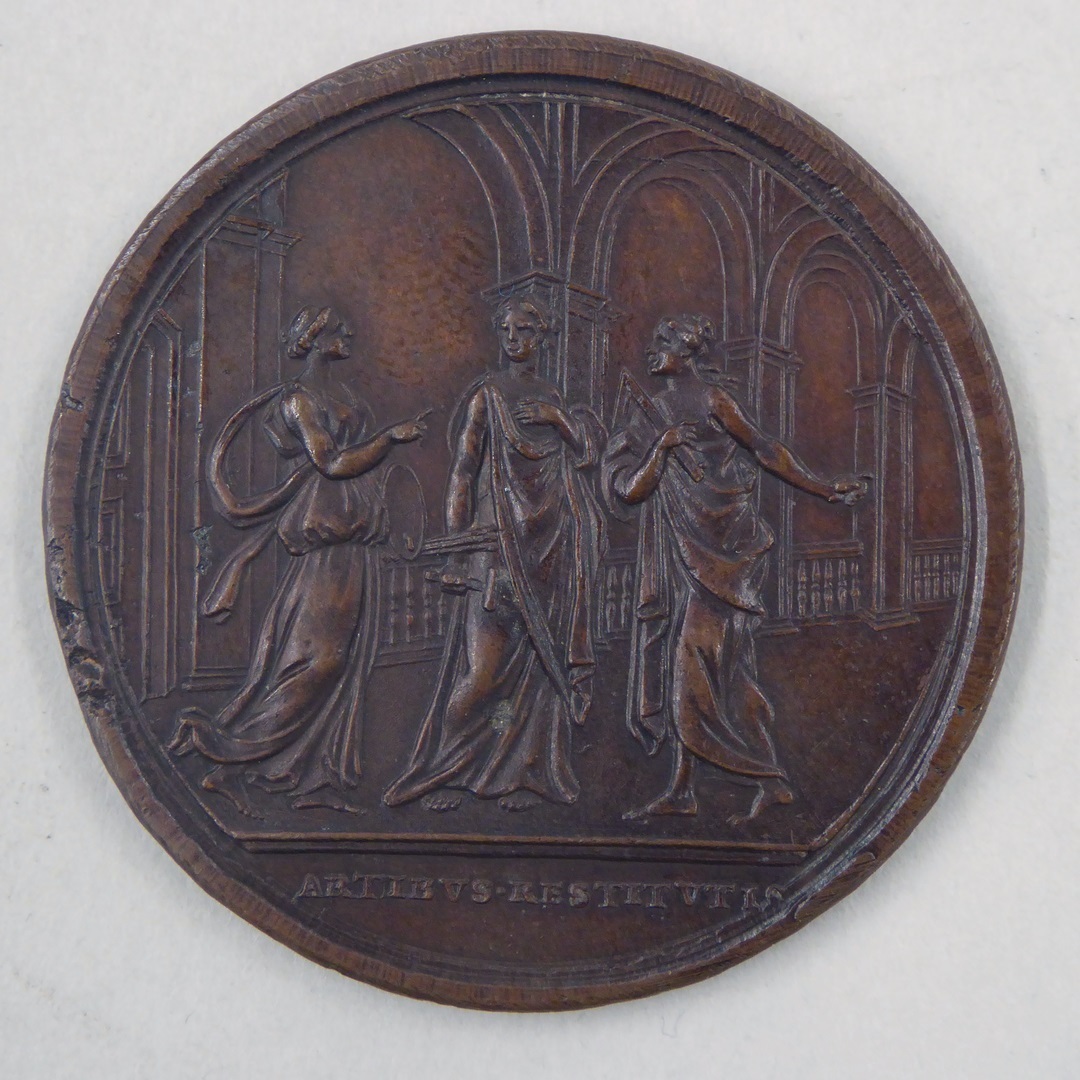 Pauspenning met portret paus Clemens XIV (1769-1774), kz. drie vrouwen, artes liberales