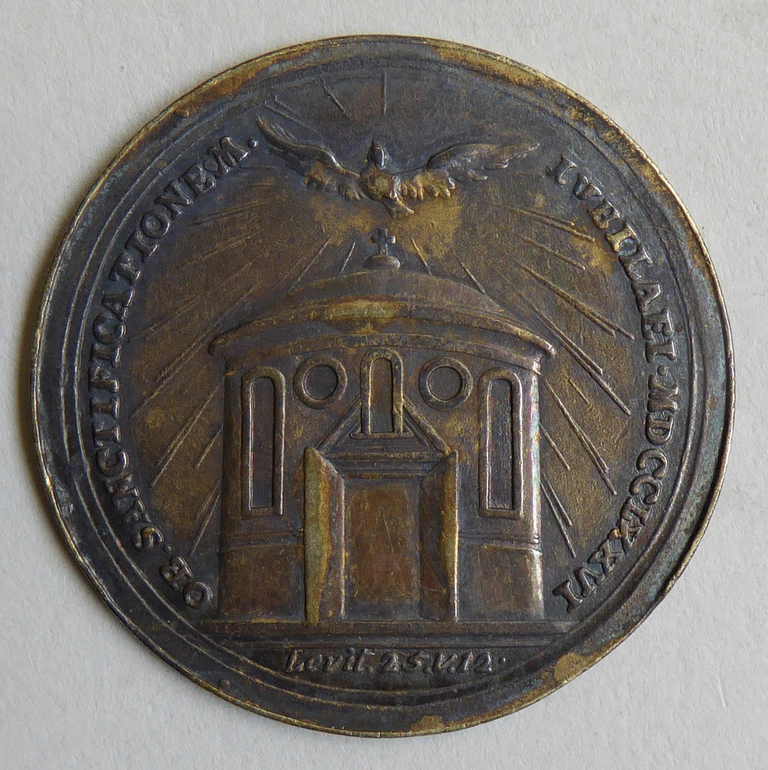 Pauspenning paus Pius VI (1775-1799) met overhandiging sleutels, kz. H. Geest boven tempel