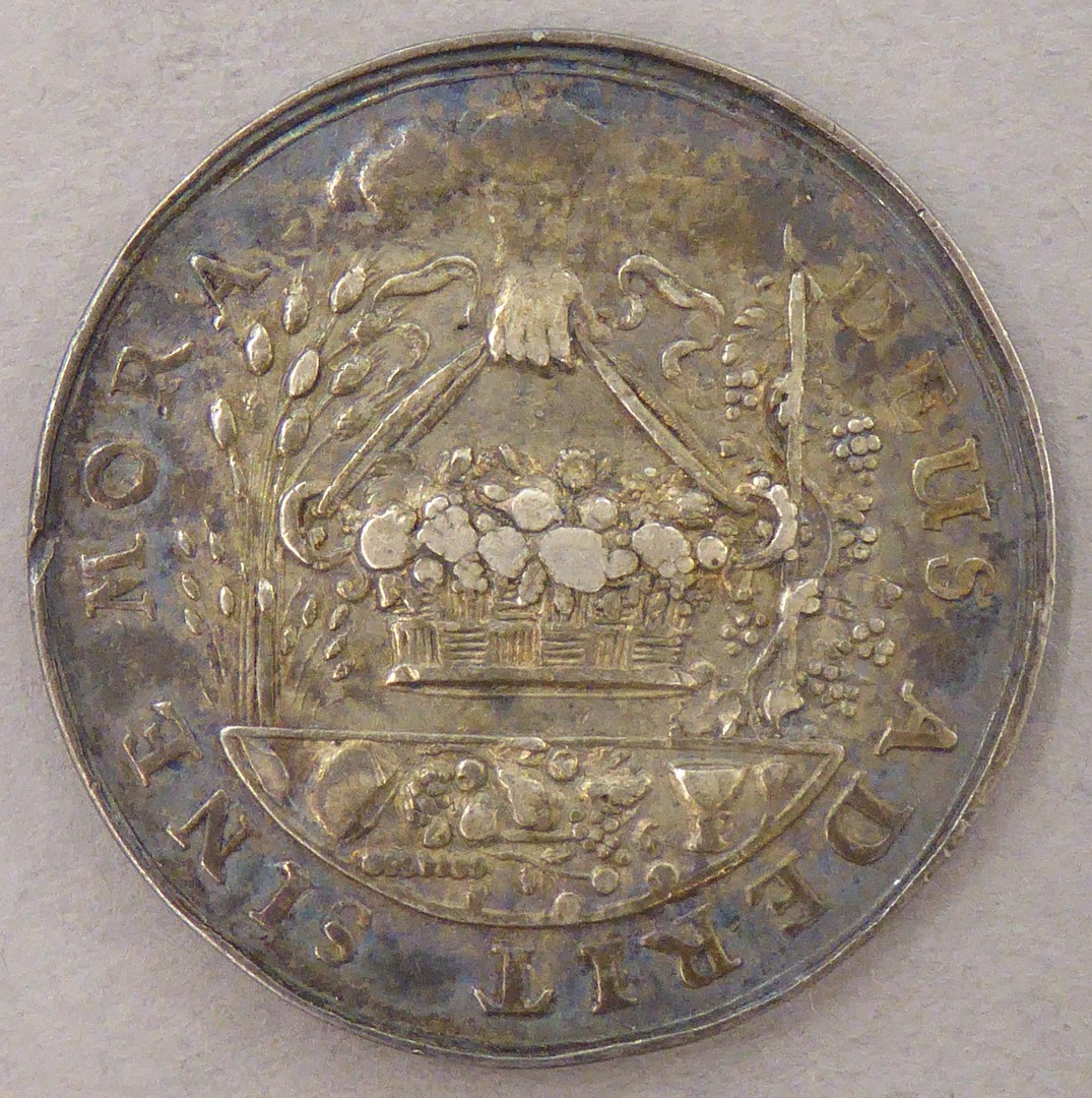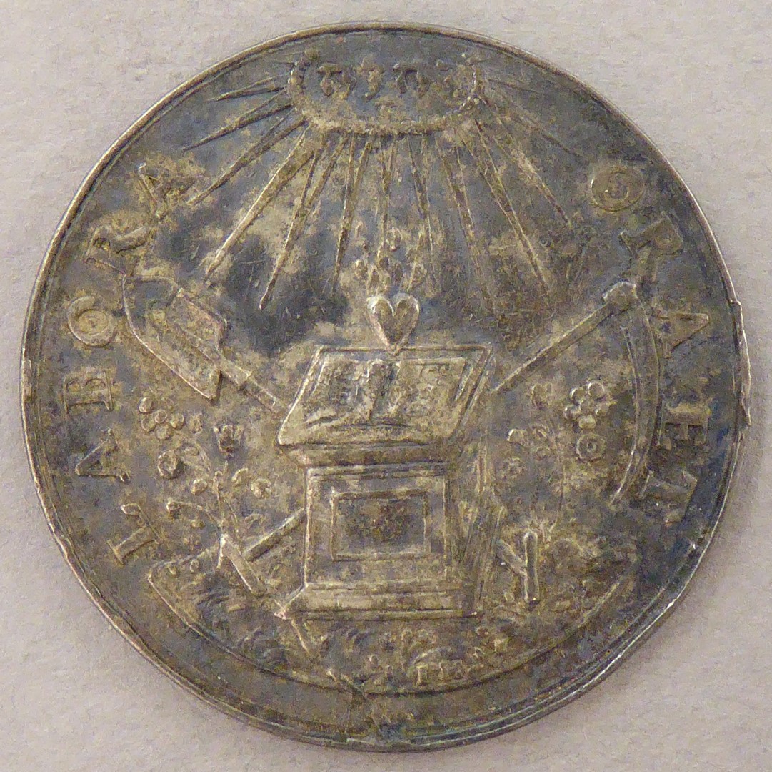Devotiepenning, spade (lente) en sikkel (zomer), met "Ora et labora", kz. "Deus aderit sine mora"