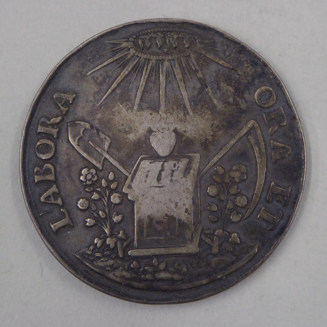 Devotiepenning, spade (lente) en sikkel (zomer), met "Ora et labora", kz. "Deus aderit sine mora"