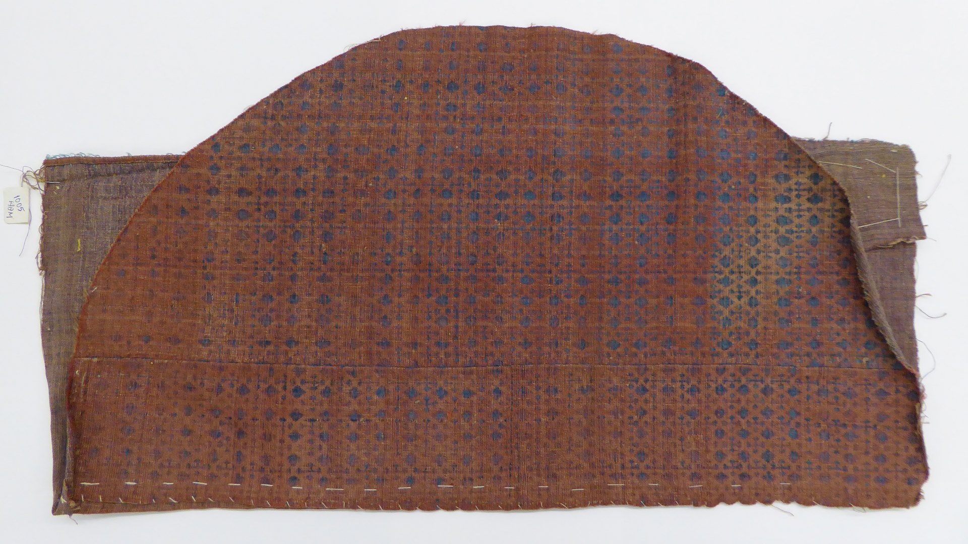 Blauw, versleten fluweel met kruisjes en ruiten met restjes van groene zijde