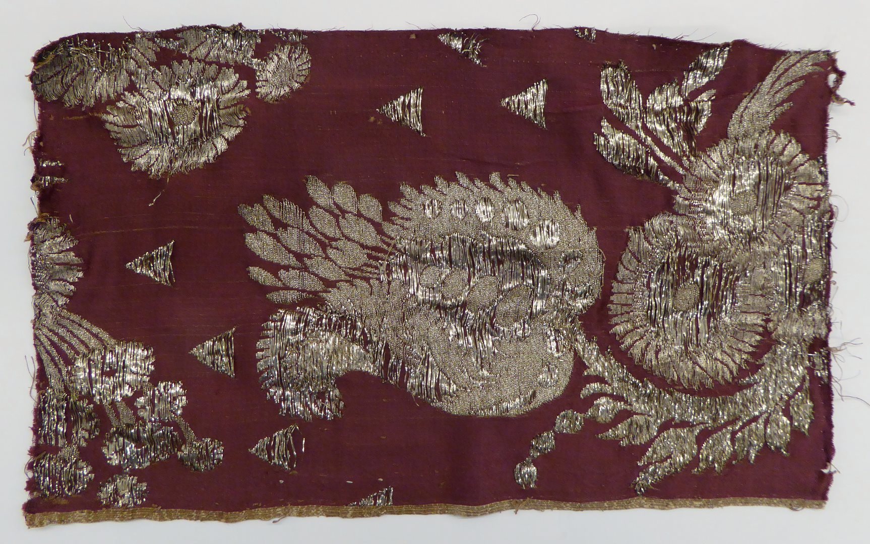 Rode halfzijde met grote bloemmotieven gebrocheerd met drie soorten gouddraad