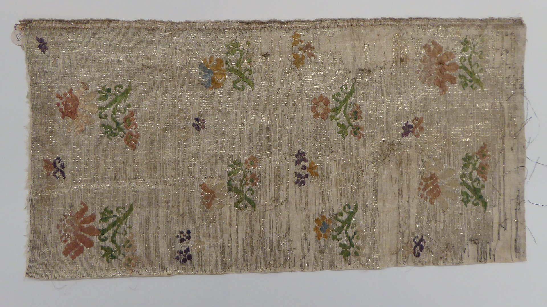Naturel weefsel met gouddraad doorweven en veelkleurige bloemen
