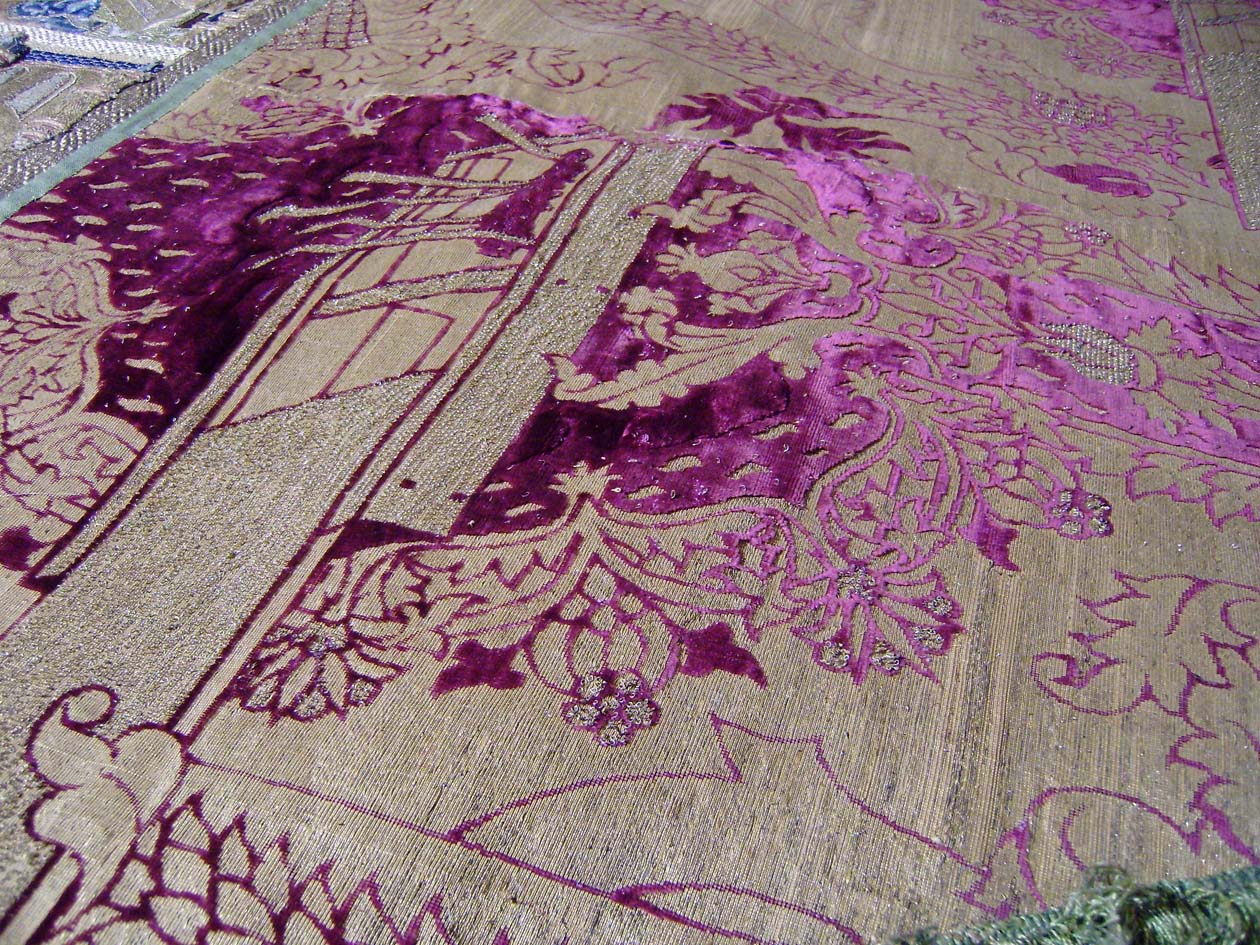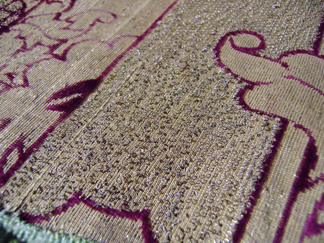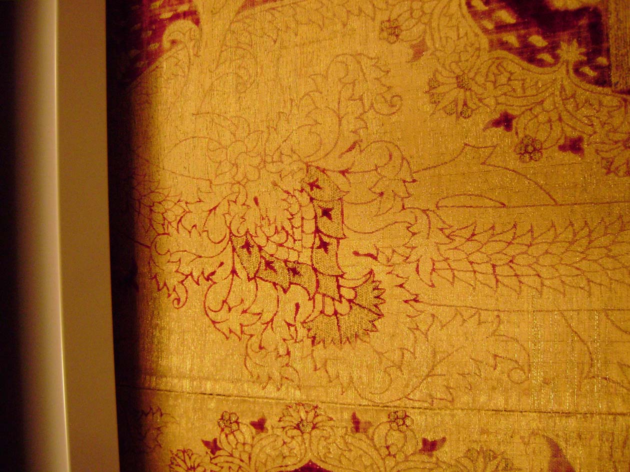 De koorkap bestaat uit zes banen donkerrode zijde, gouddraad en een poolweefsel, met name fluweel. De achtergrond bestaat hoofdzakelijk uit gouddraad en het gebrocheerde patroon is een slingerend granaatappelmotief met kleine vertakkingen van bladeren en vruchten uit deels geciseleerd zijdefluweel. De stengel van de granaatappel is bezaaid met vonken, die uit de tondeldoos met vuursteen ...