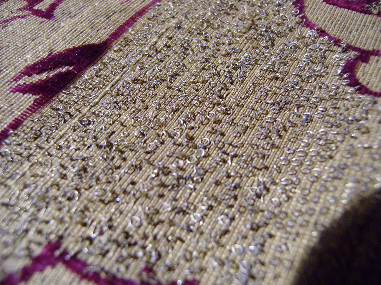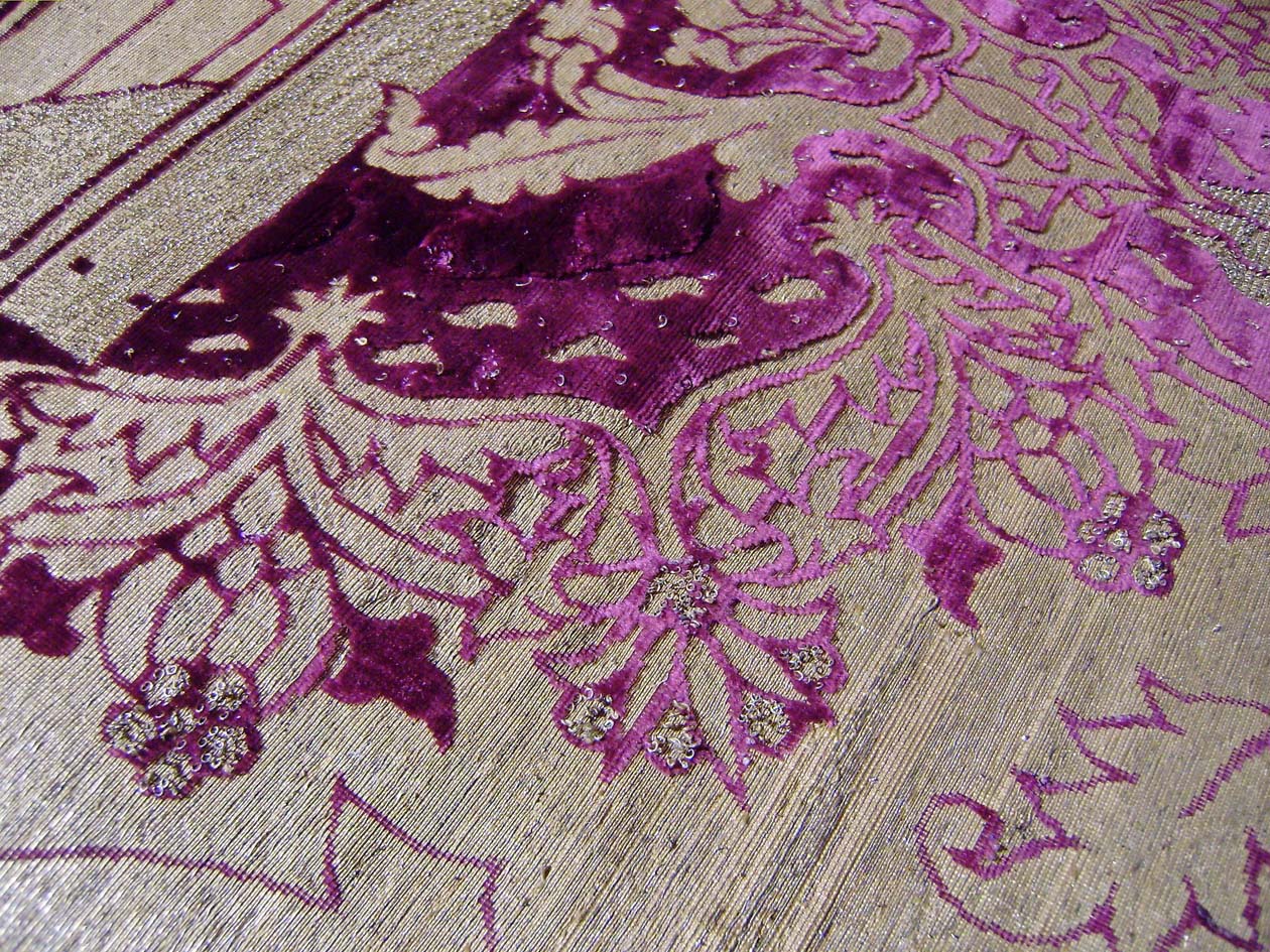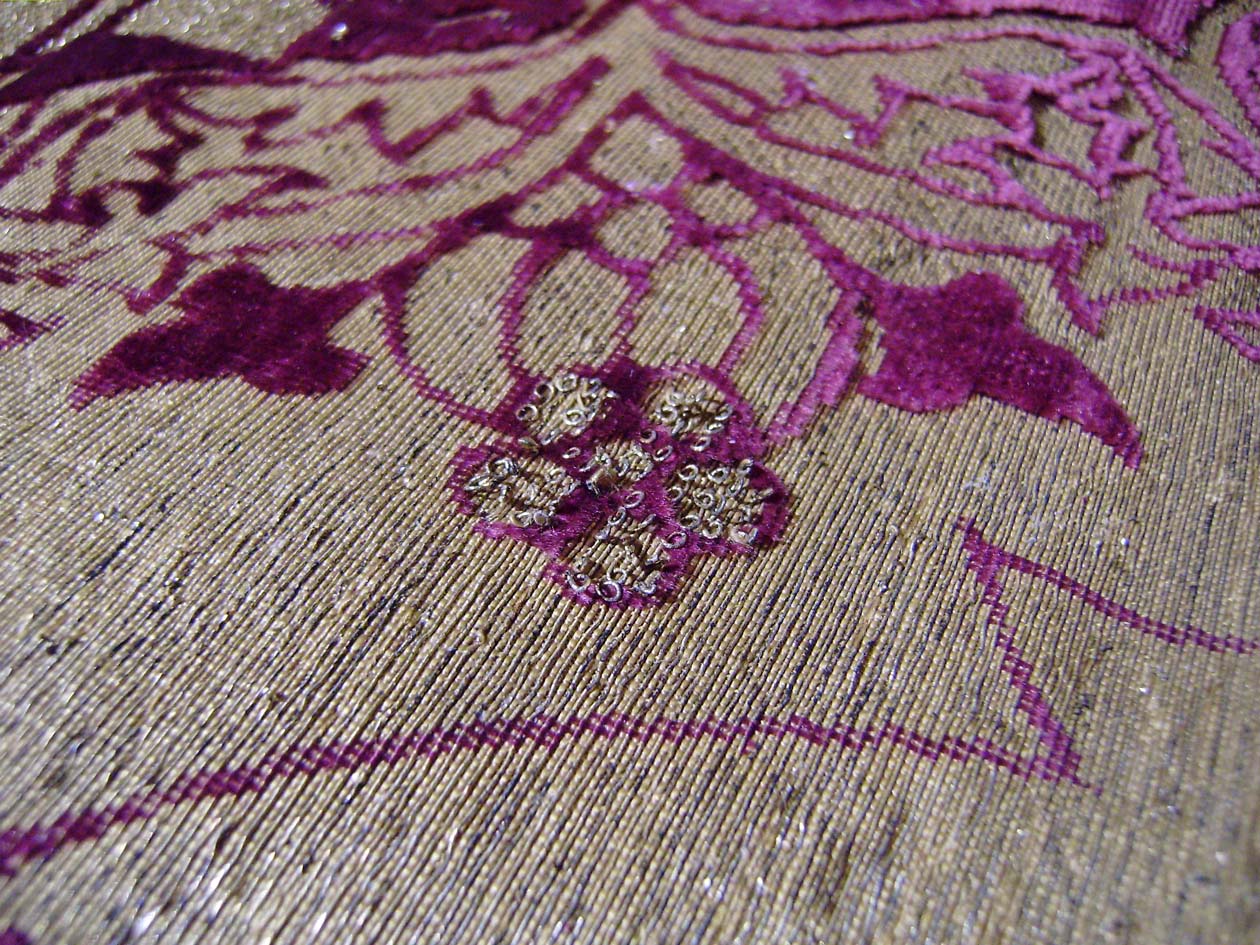 De koorkap bestaat uit zes banen donkerrode zijde, gouddraad en een poolweefsel, met name fluweel. De achtergrond bestaat hoofdzakelijk uit gouddraad en het gebrocheerde patroon is een slingerend granaatappelmotief met kleine vertakkingen van bladeren en vruchten uit deels geciseleerd zijdefluweel. De stengel van de granaatappel is bezaaid met vonken, die uit de tondeldoos met vuursteen ...