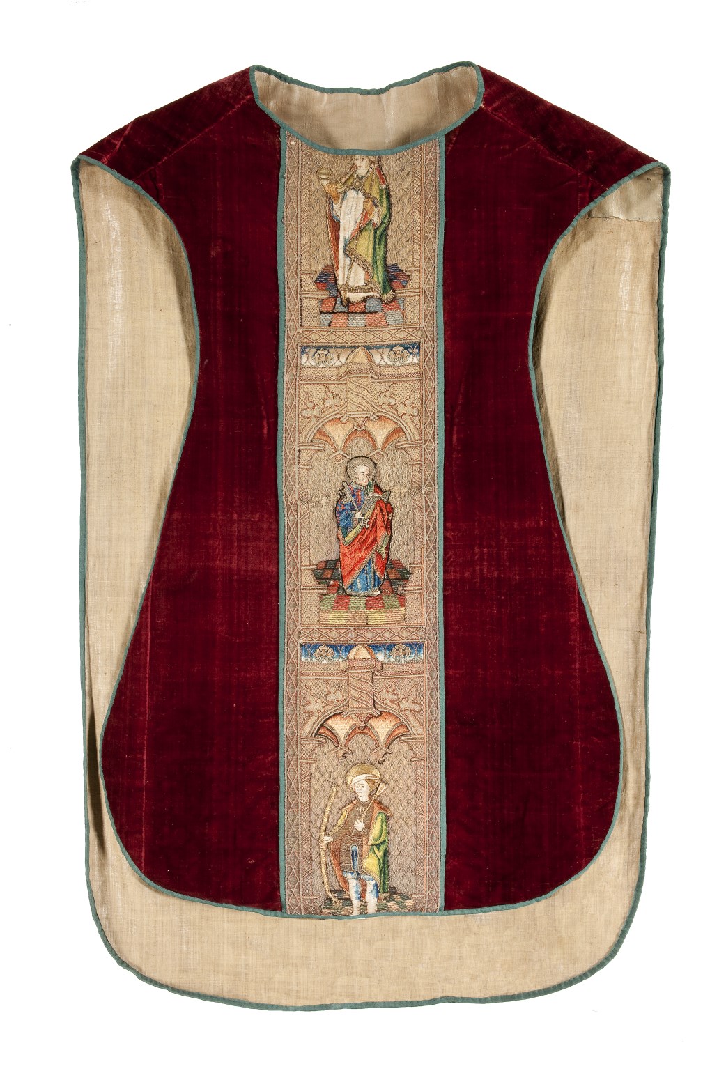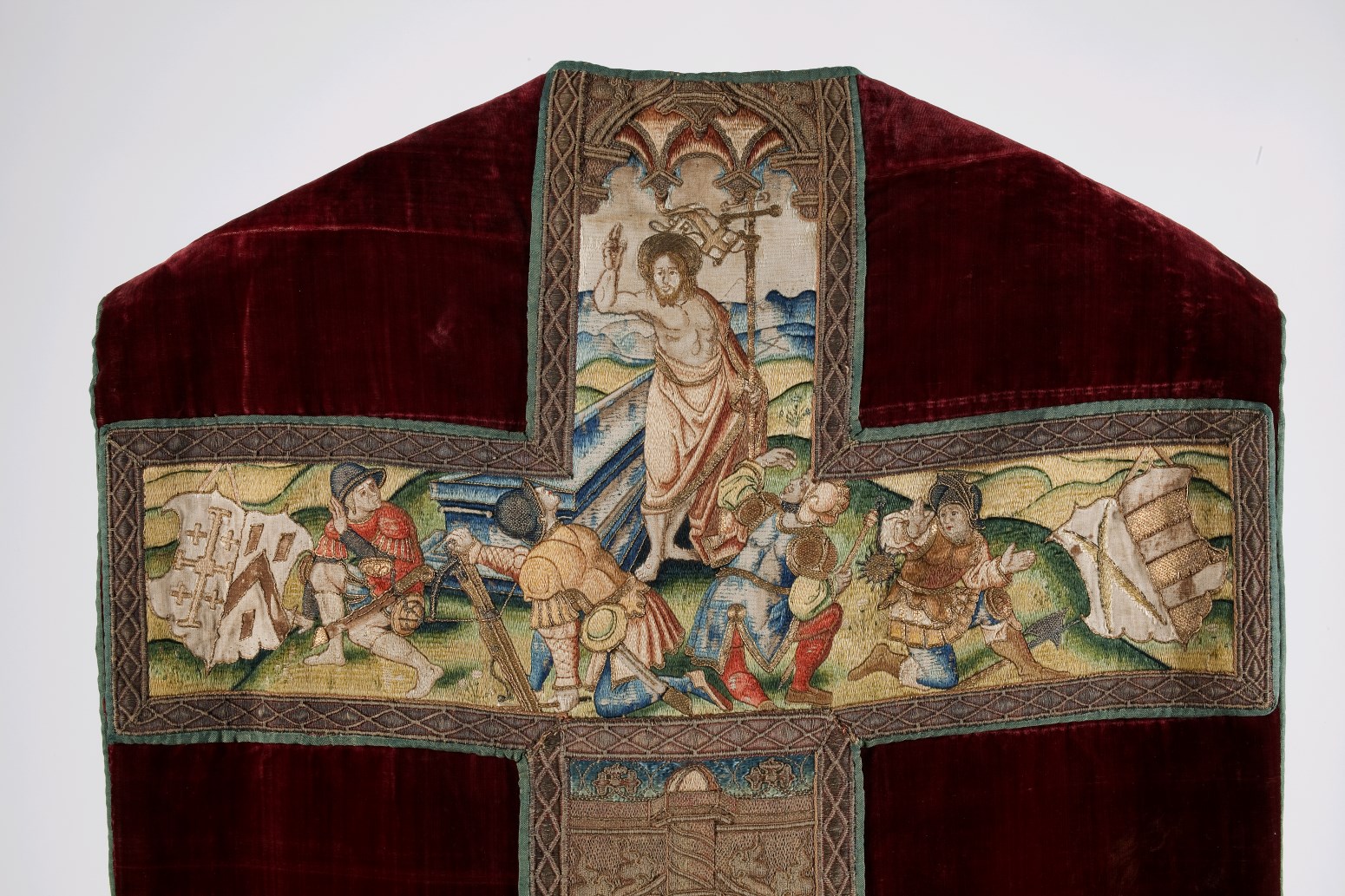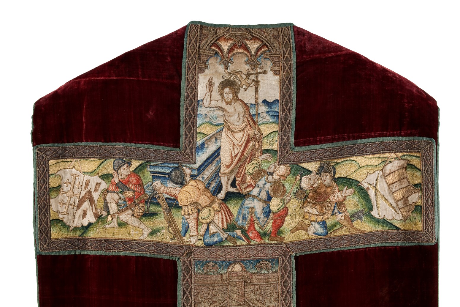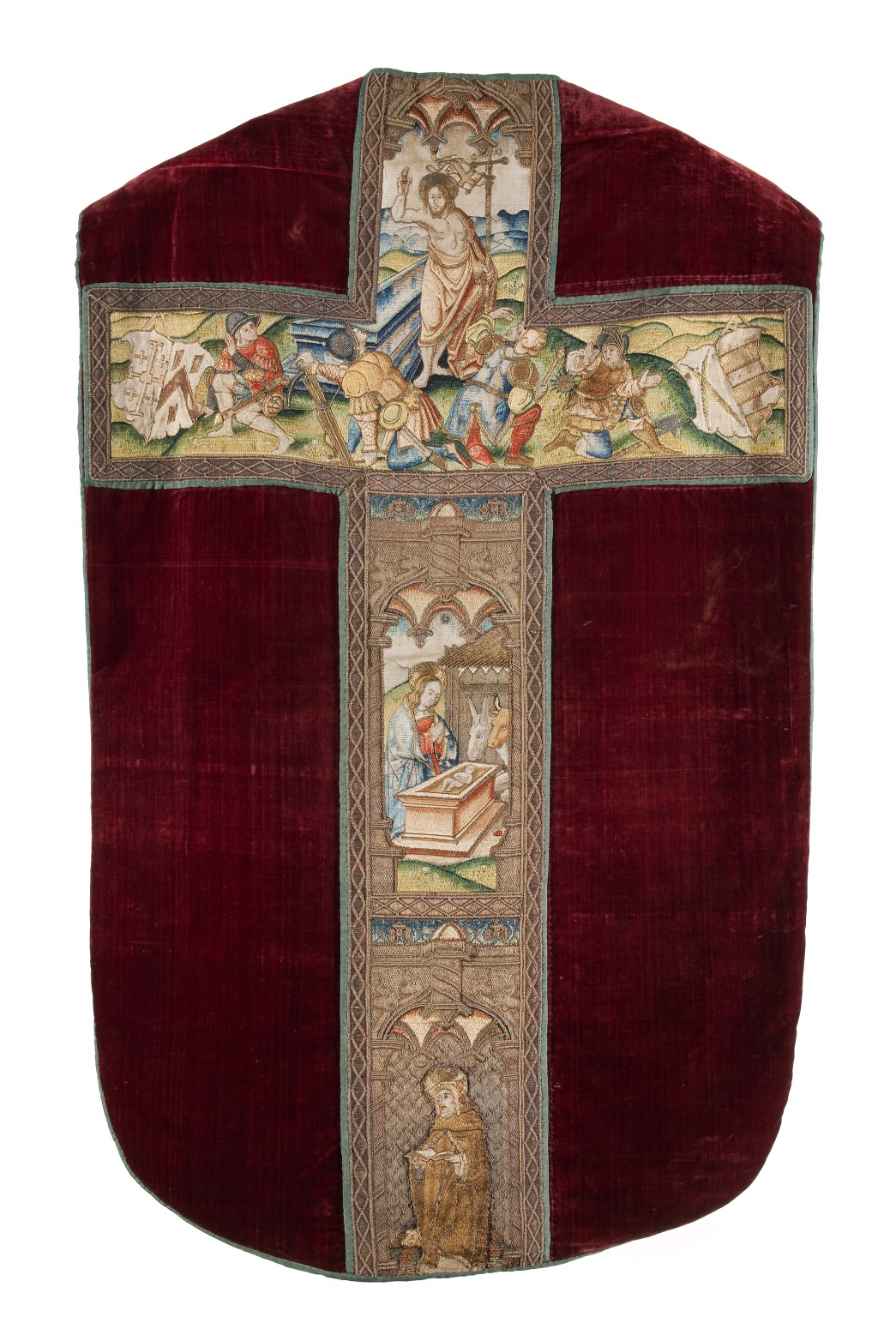 Rood kazuifel met verrijzenis, geboorte Christus, diverse heiligen en wapens