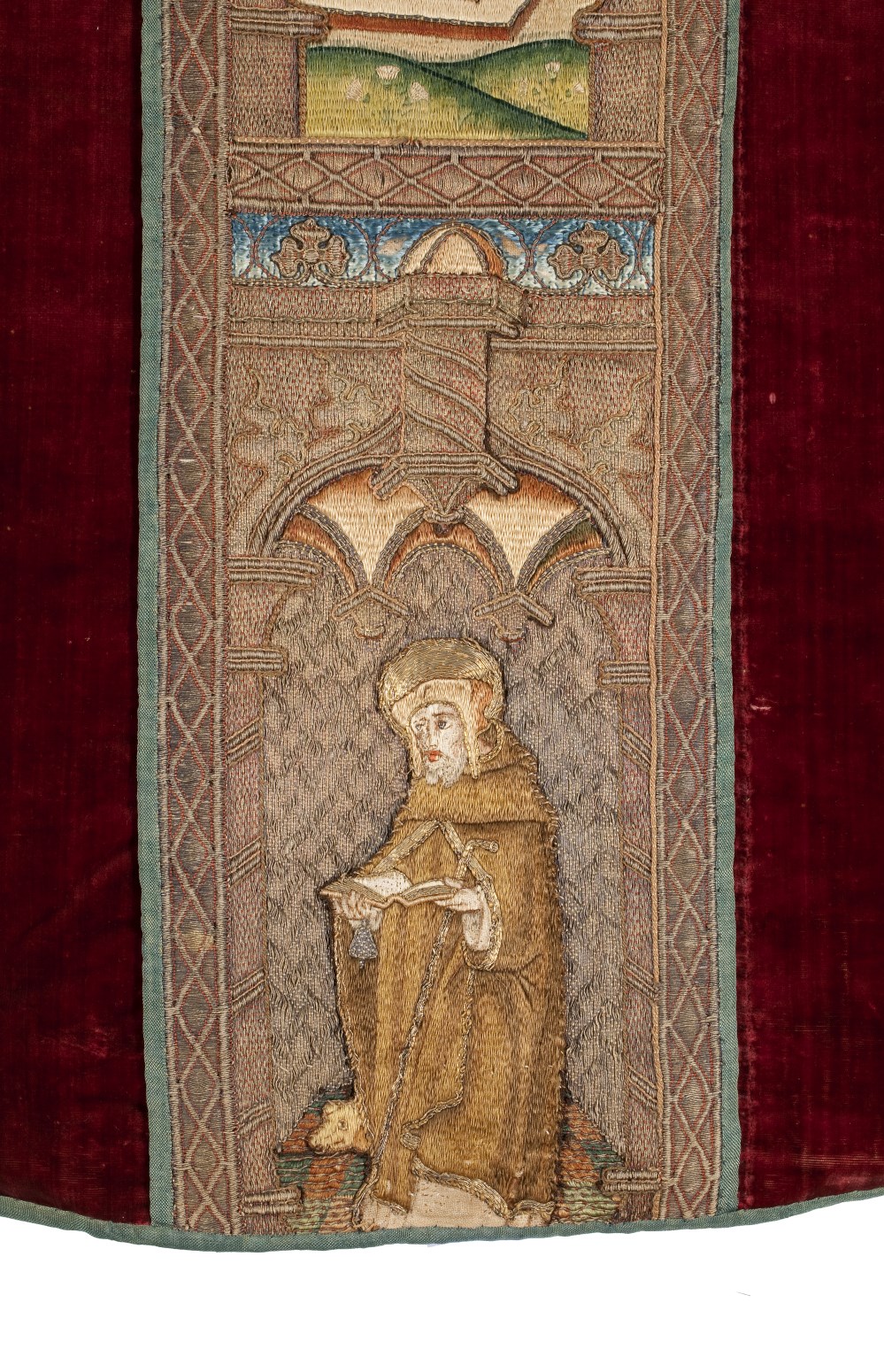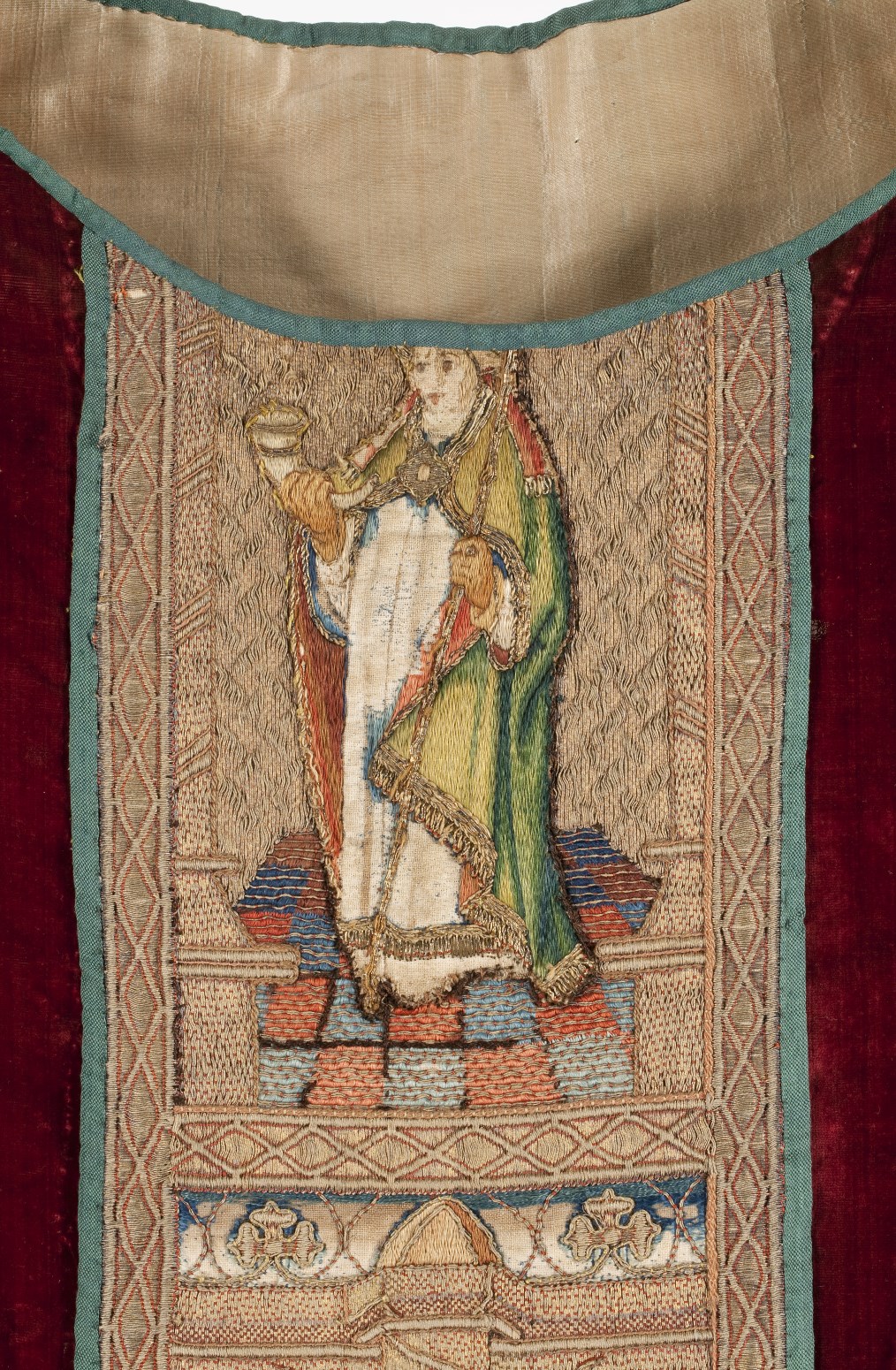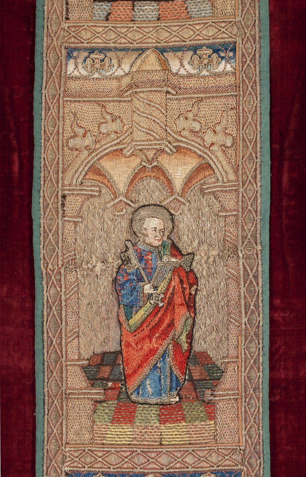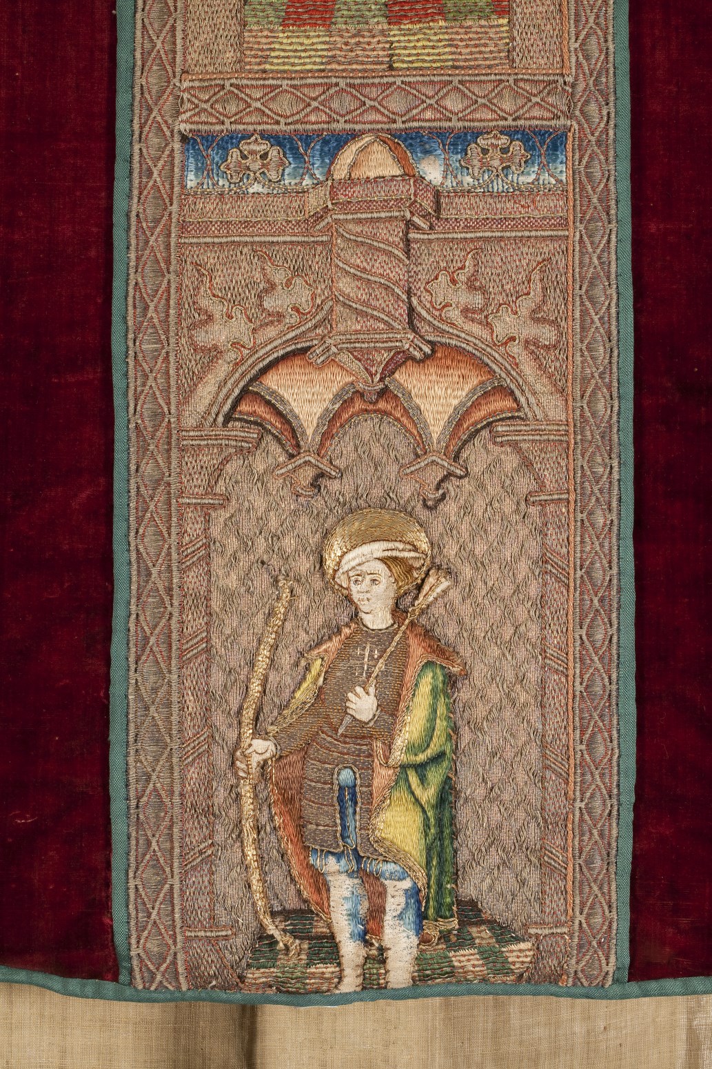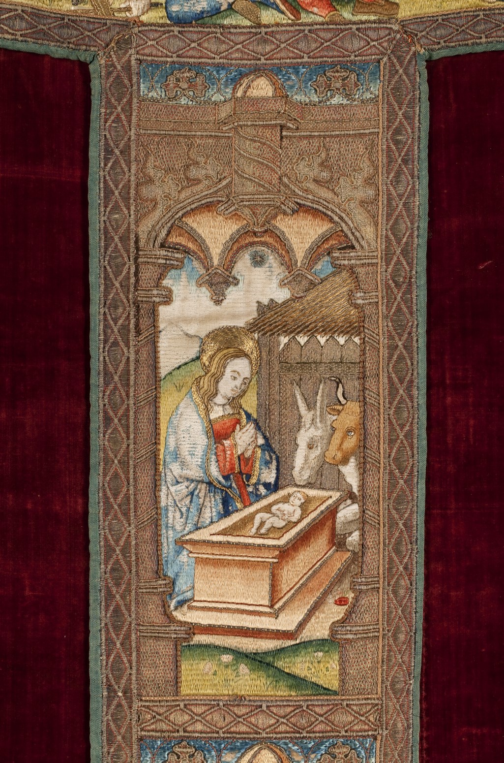 Rood kazuifel met verrijzenis, geboorte Christus, diverse heiligen en wapens