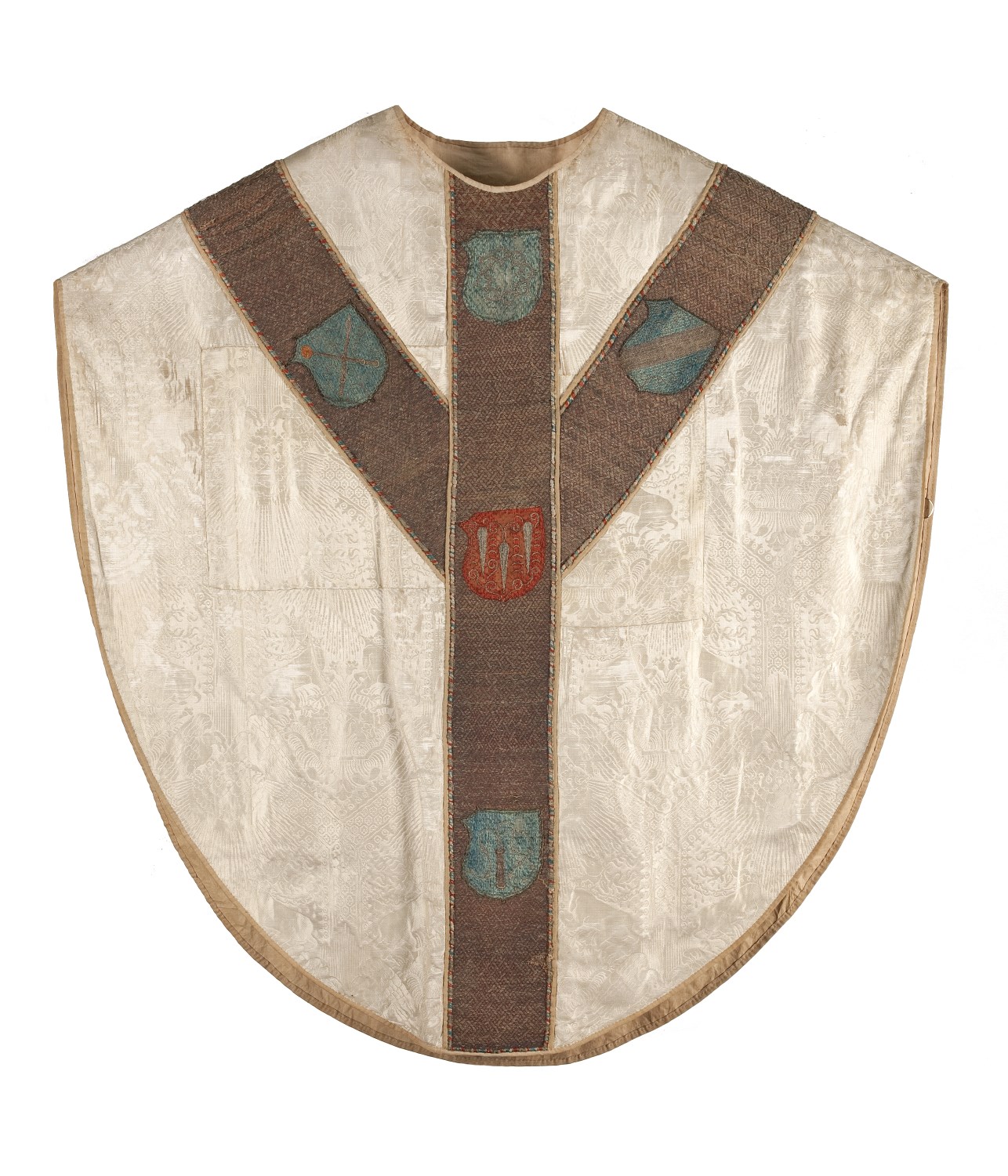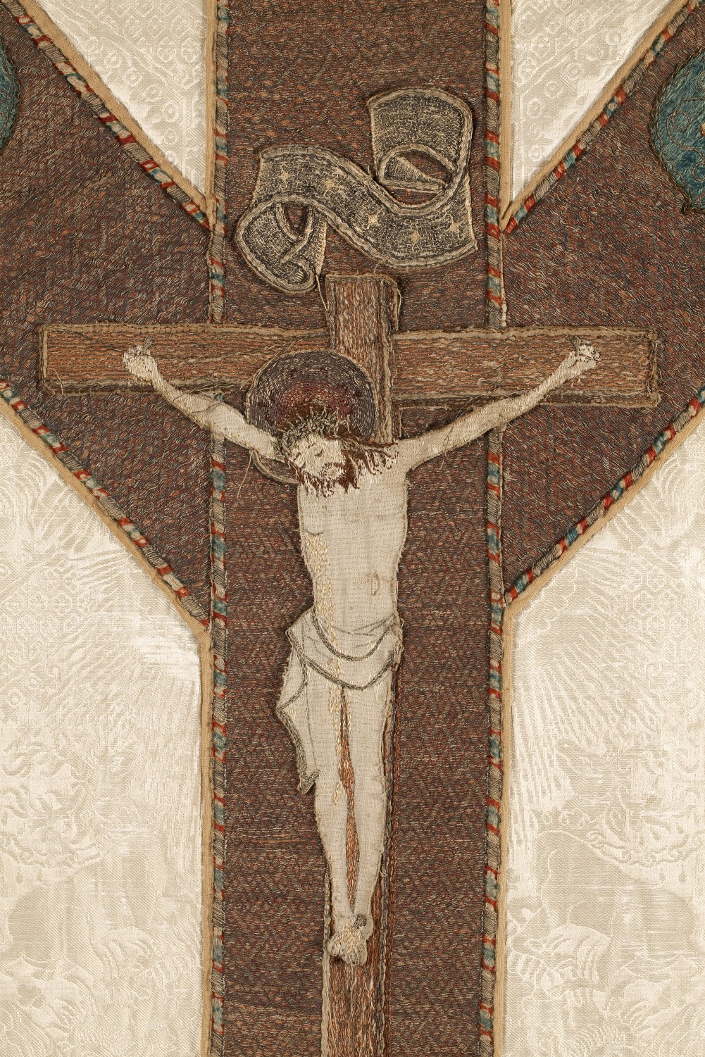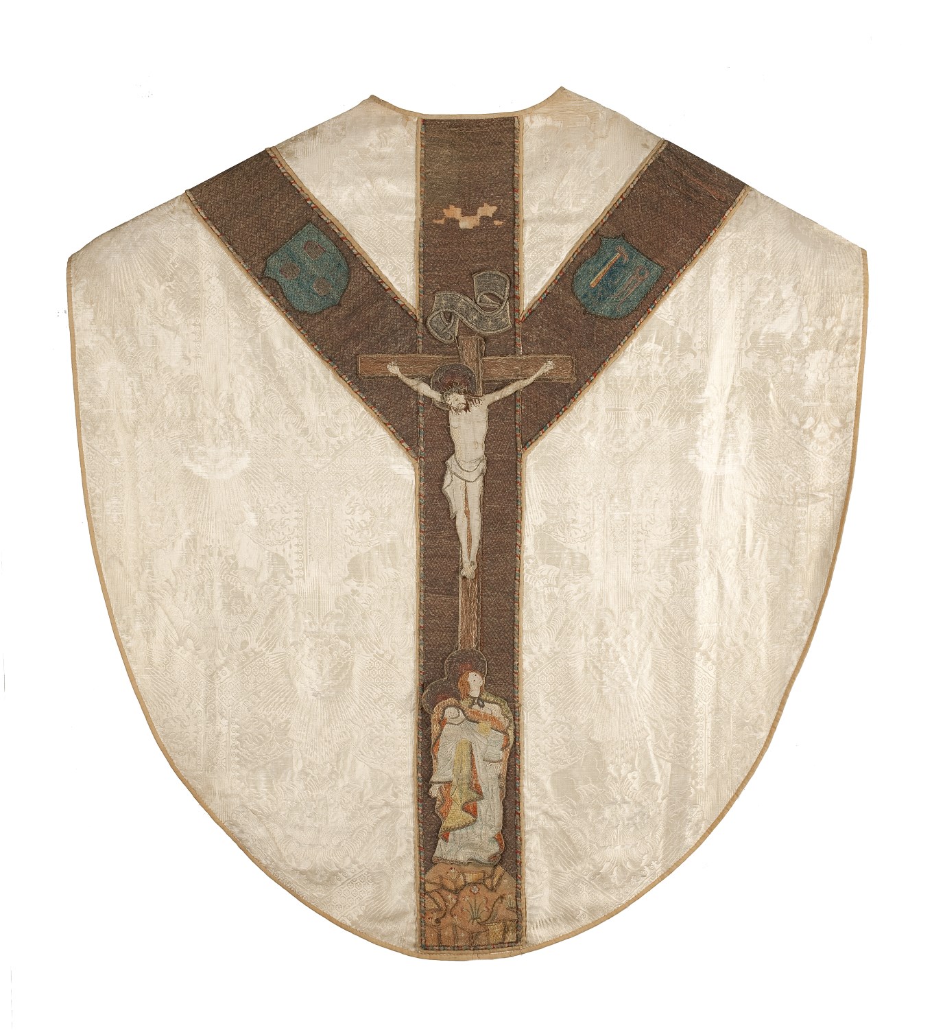 Wit kazuifel, stof kopie Venetiaans motief vijftiende eeuw met kruisiging