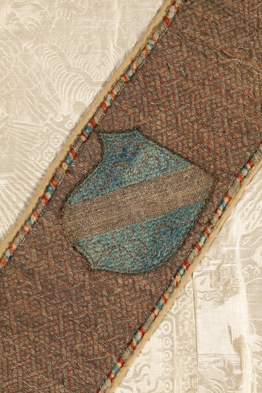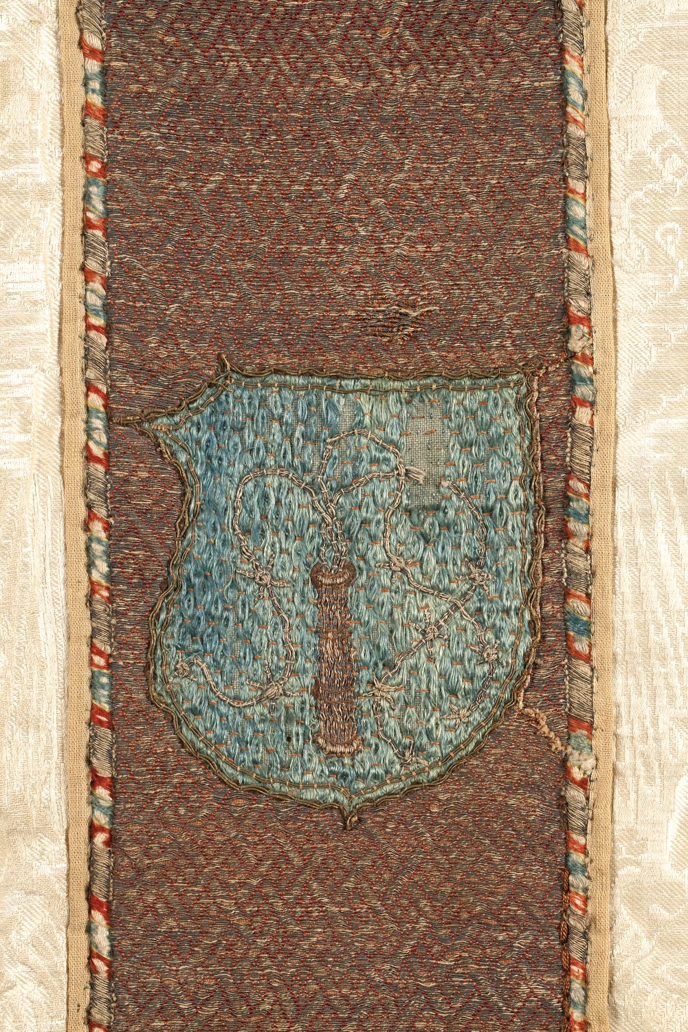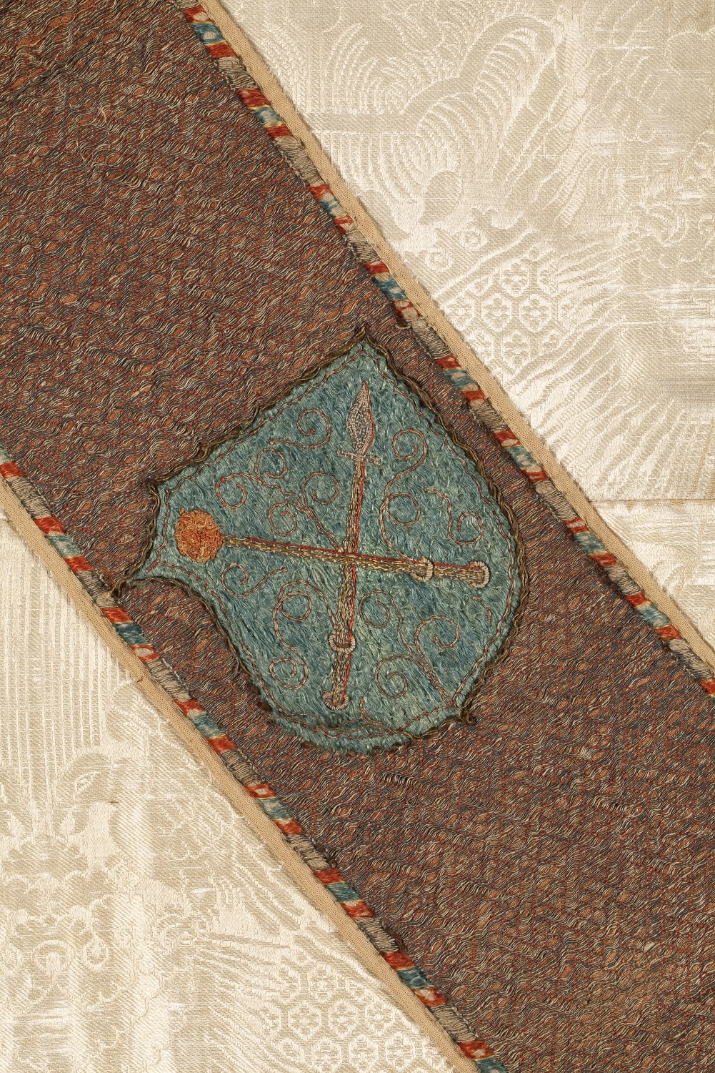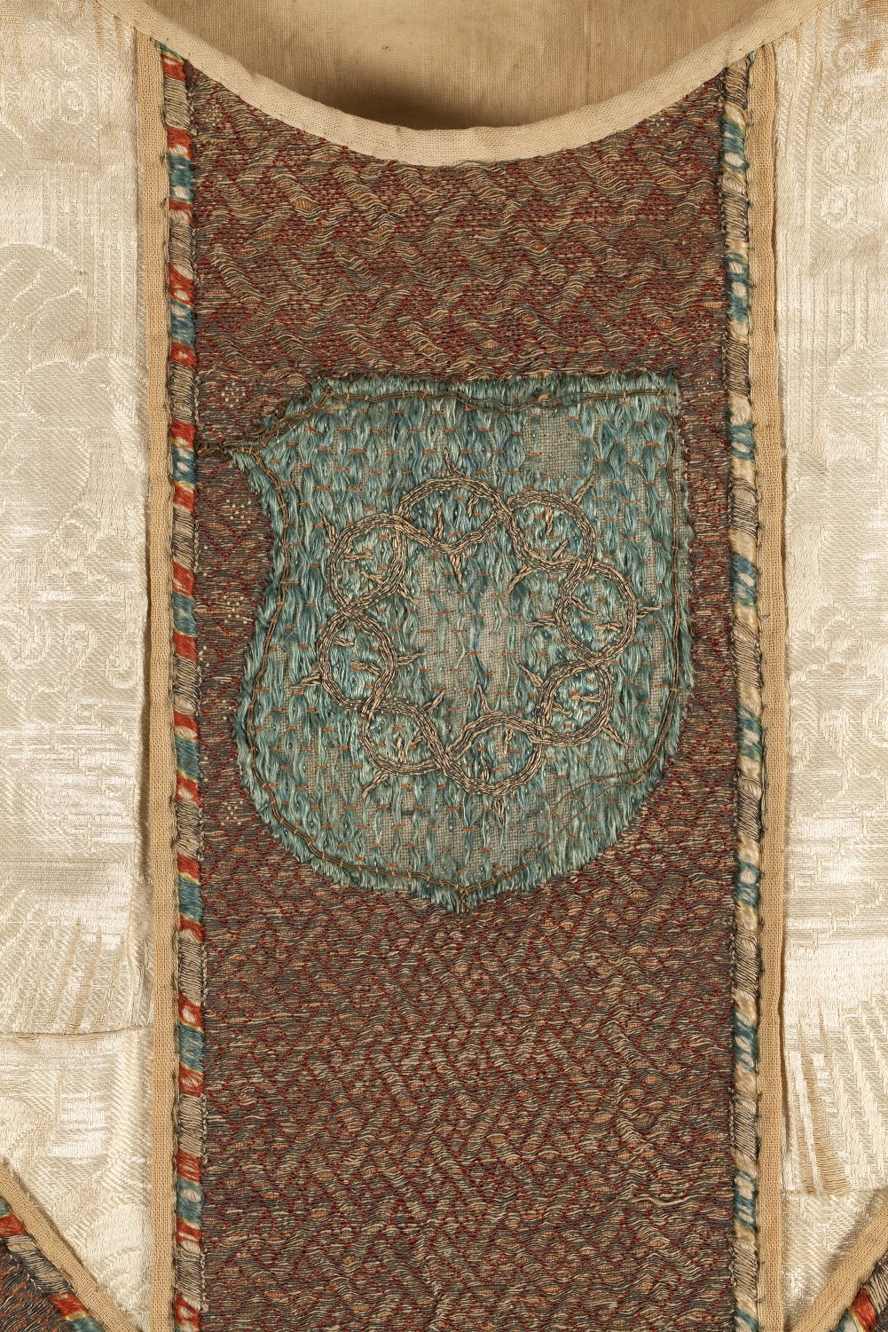 Wit kazuifel, stof kopie Venetiaans motief vijftiende eeuw met kruisiging