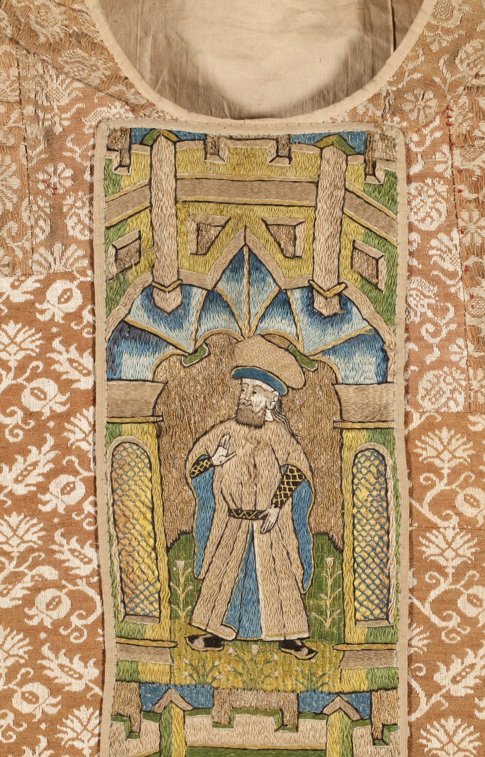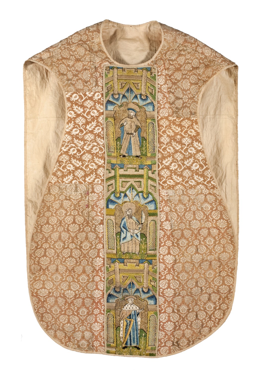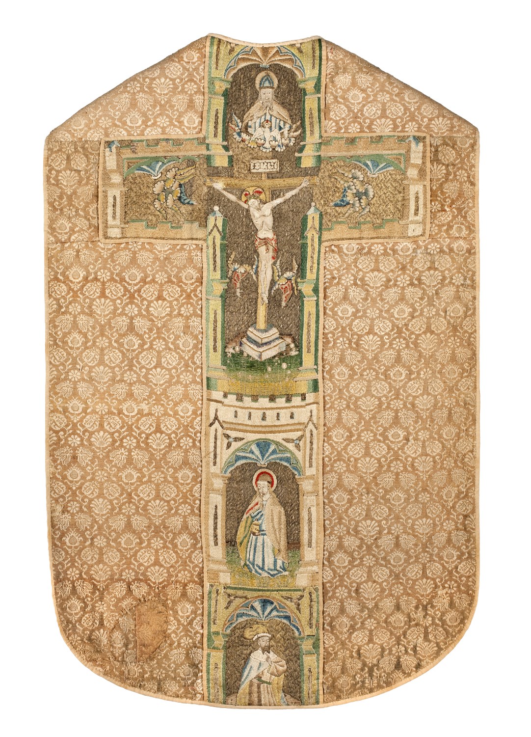 Bruin-wit gebloemd kazuifel met kruisiging, heiligen en profeten
