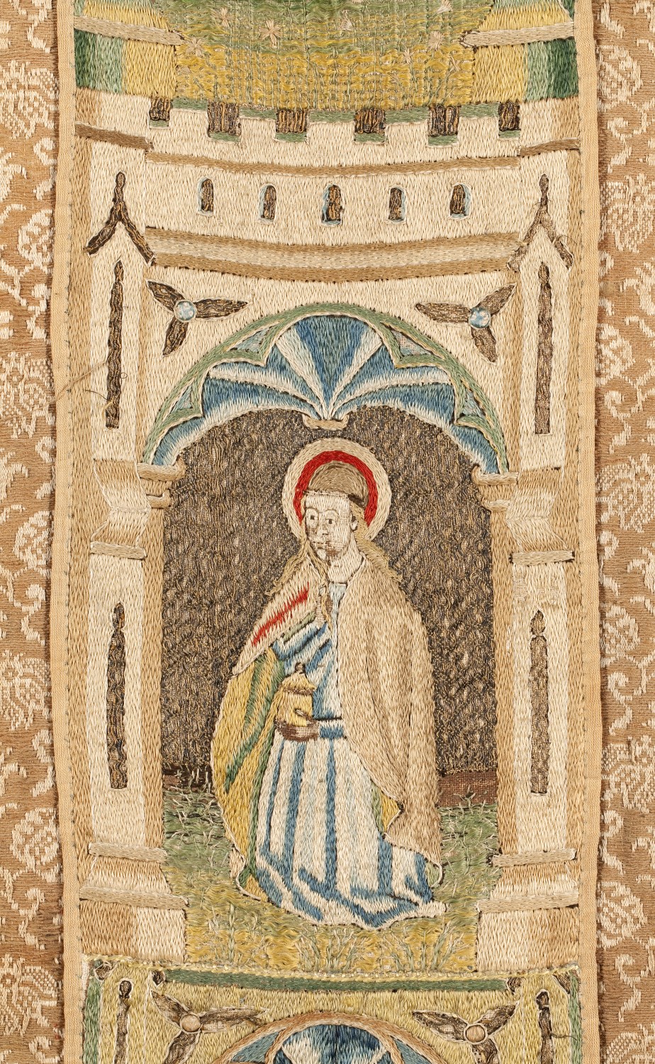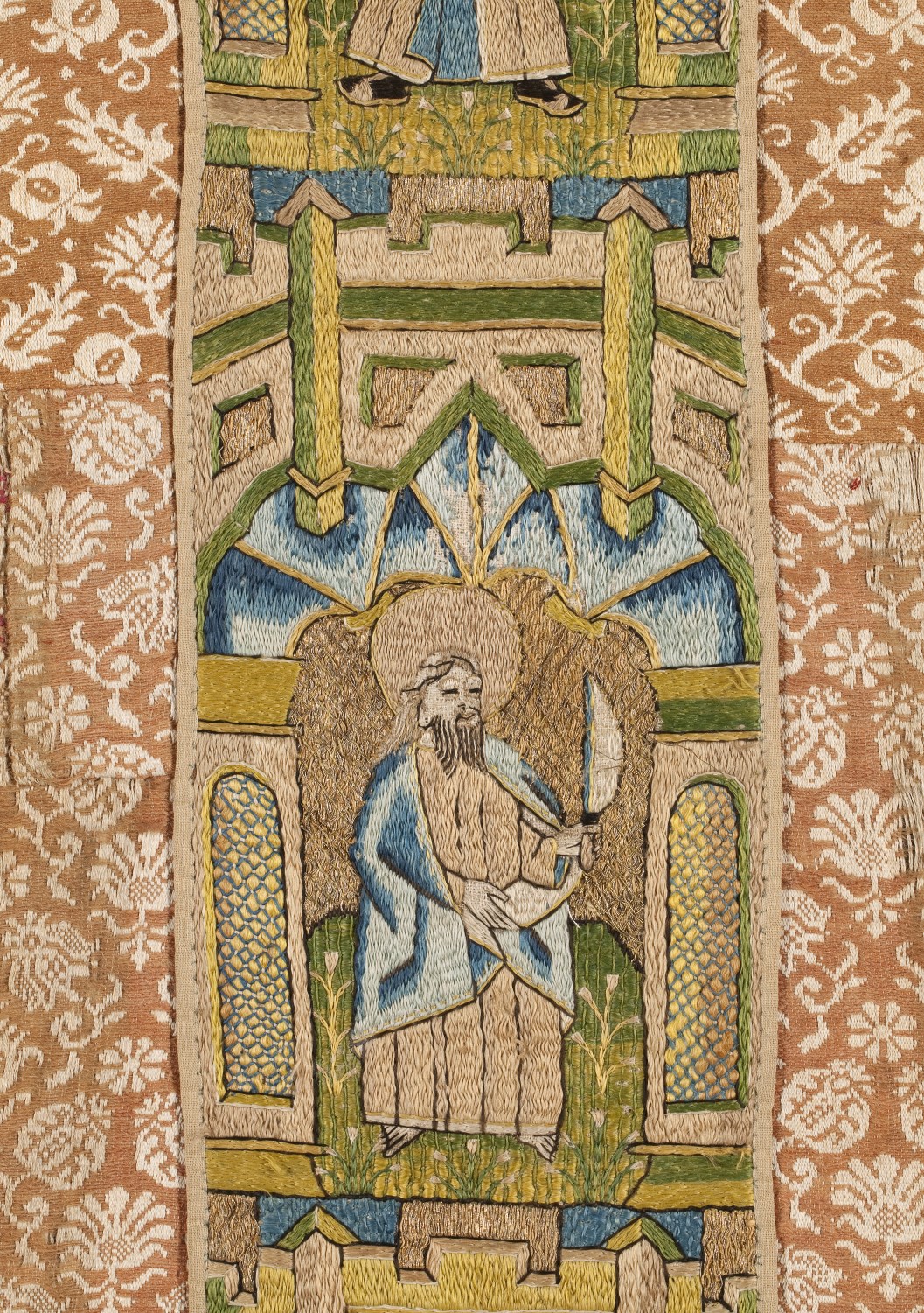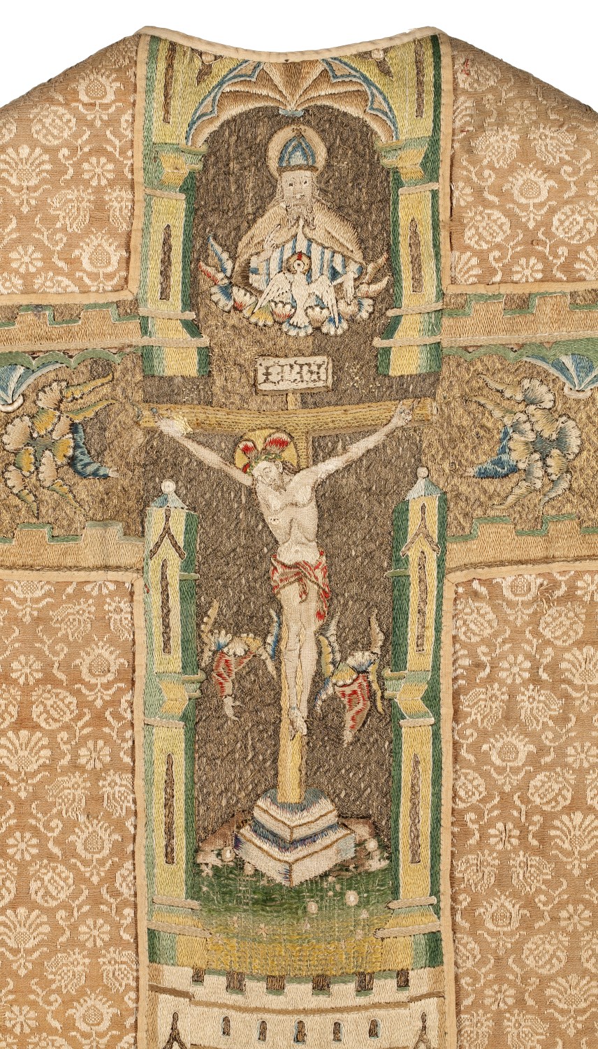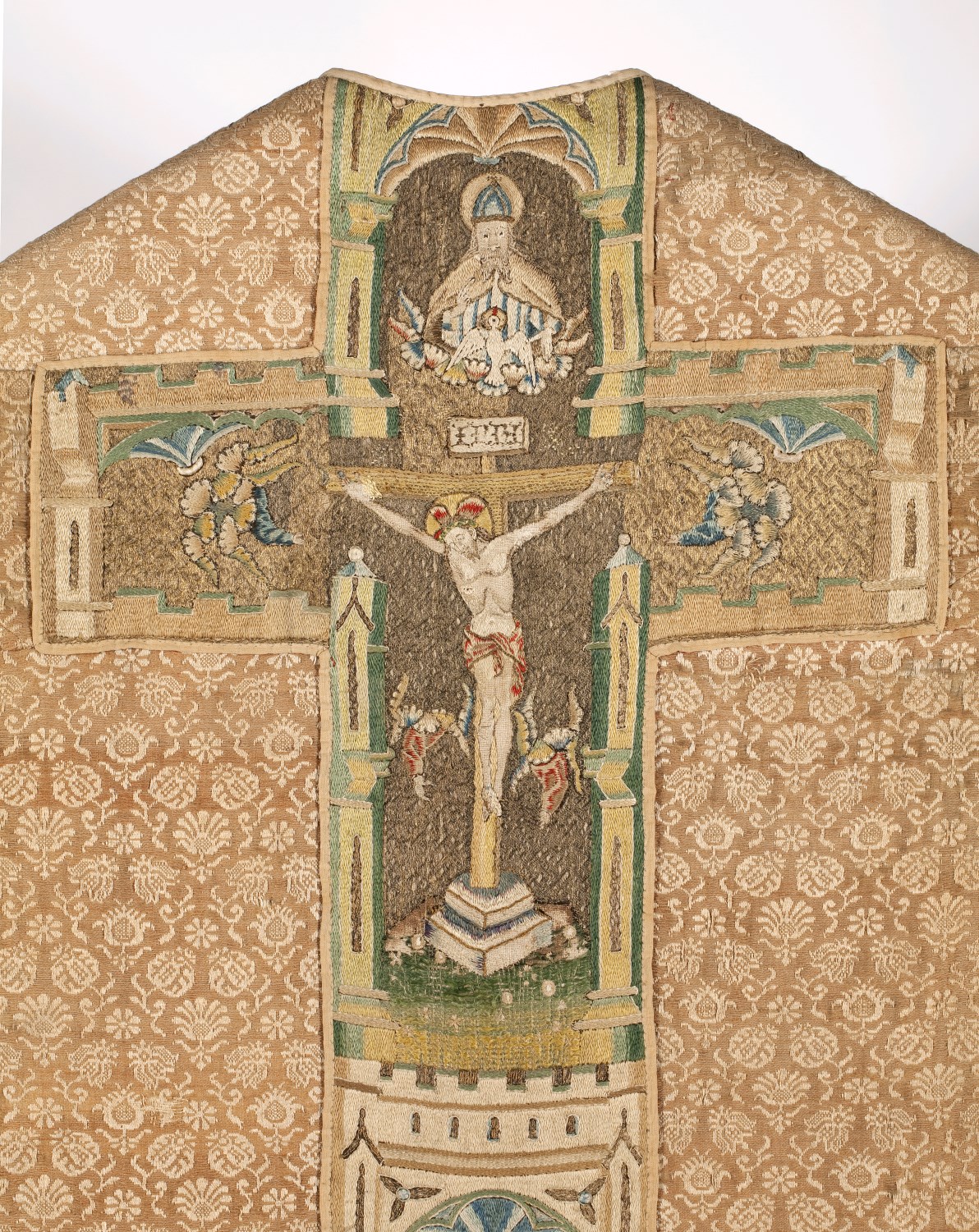 Bruin-wit gebloemd kazuifel met kruisiging, heiligen en profeten