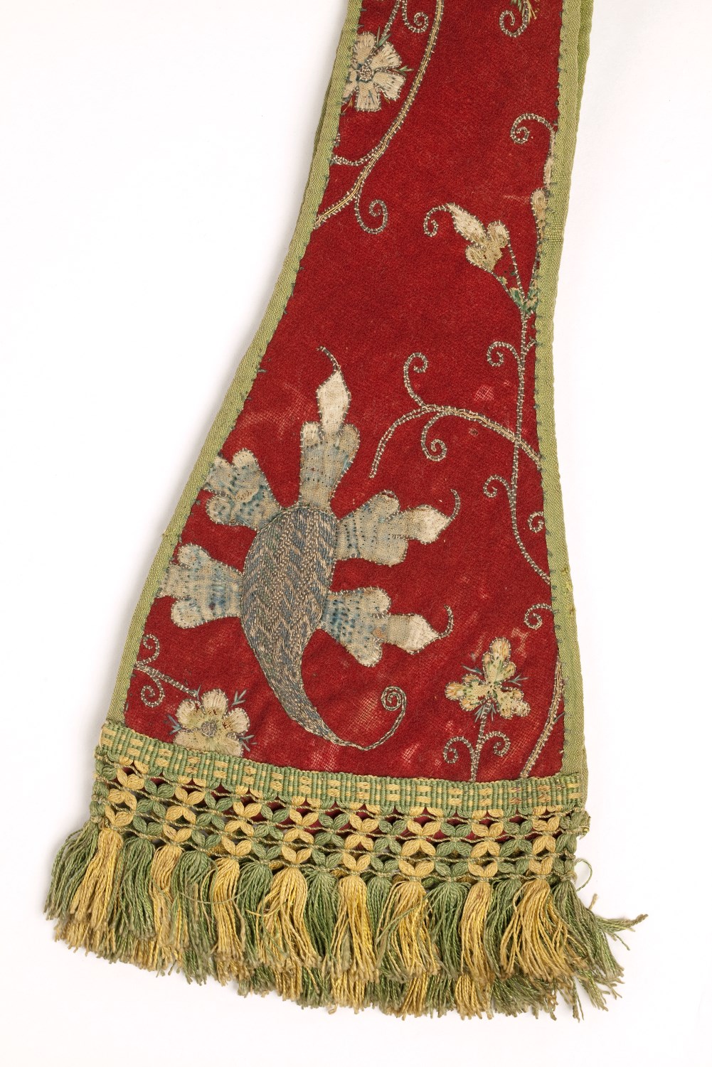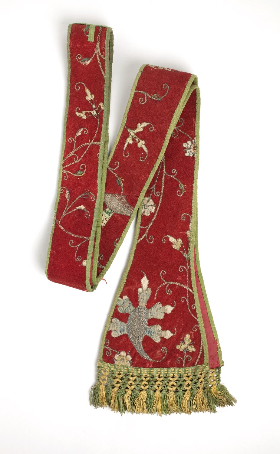 De stola is van rood laken. Hierop zijn bloemen en ranken geborduurd in eenzelfde patroon als het bijbehorende kazuifel ABM t2010a. Techniek: zie ABM t2010a.