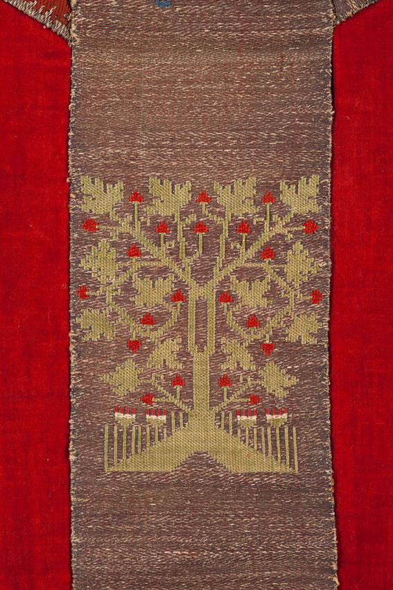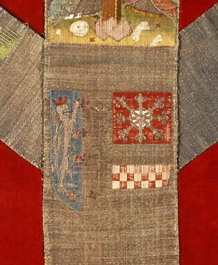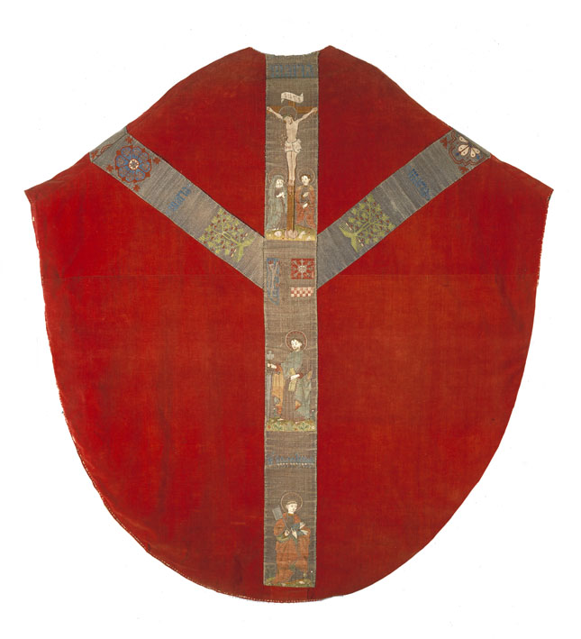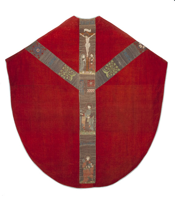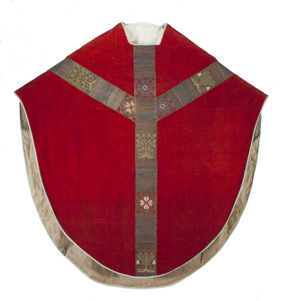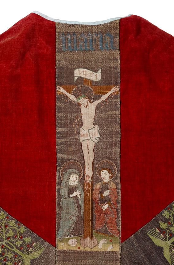 Rood kazuifel met Kölner Borten met kruisiging en wapen Catharina van Kleef