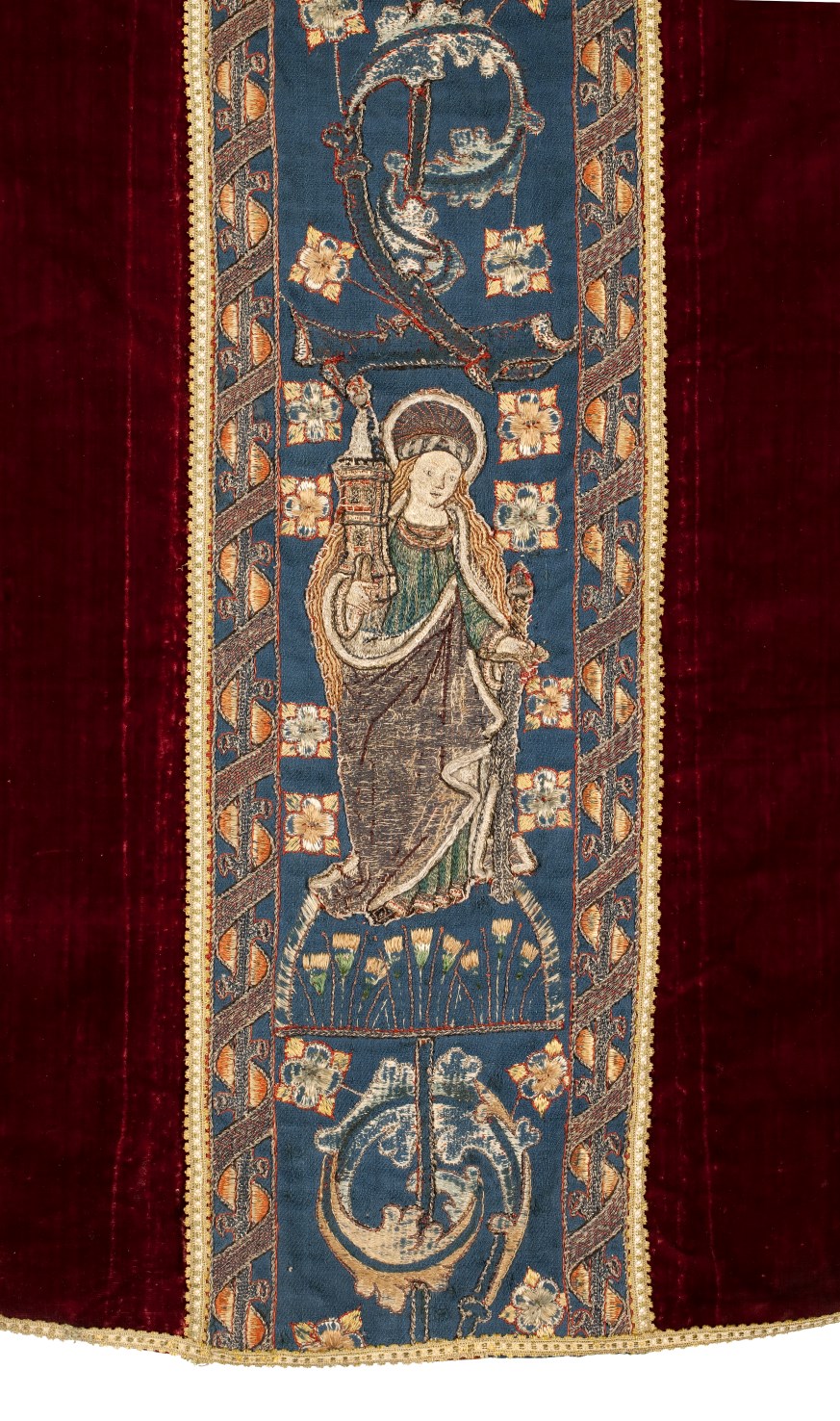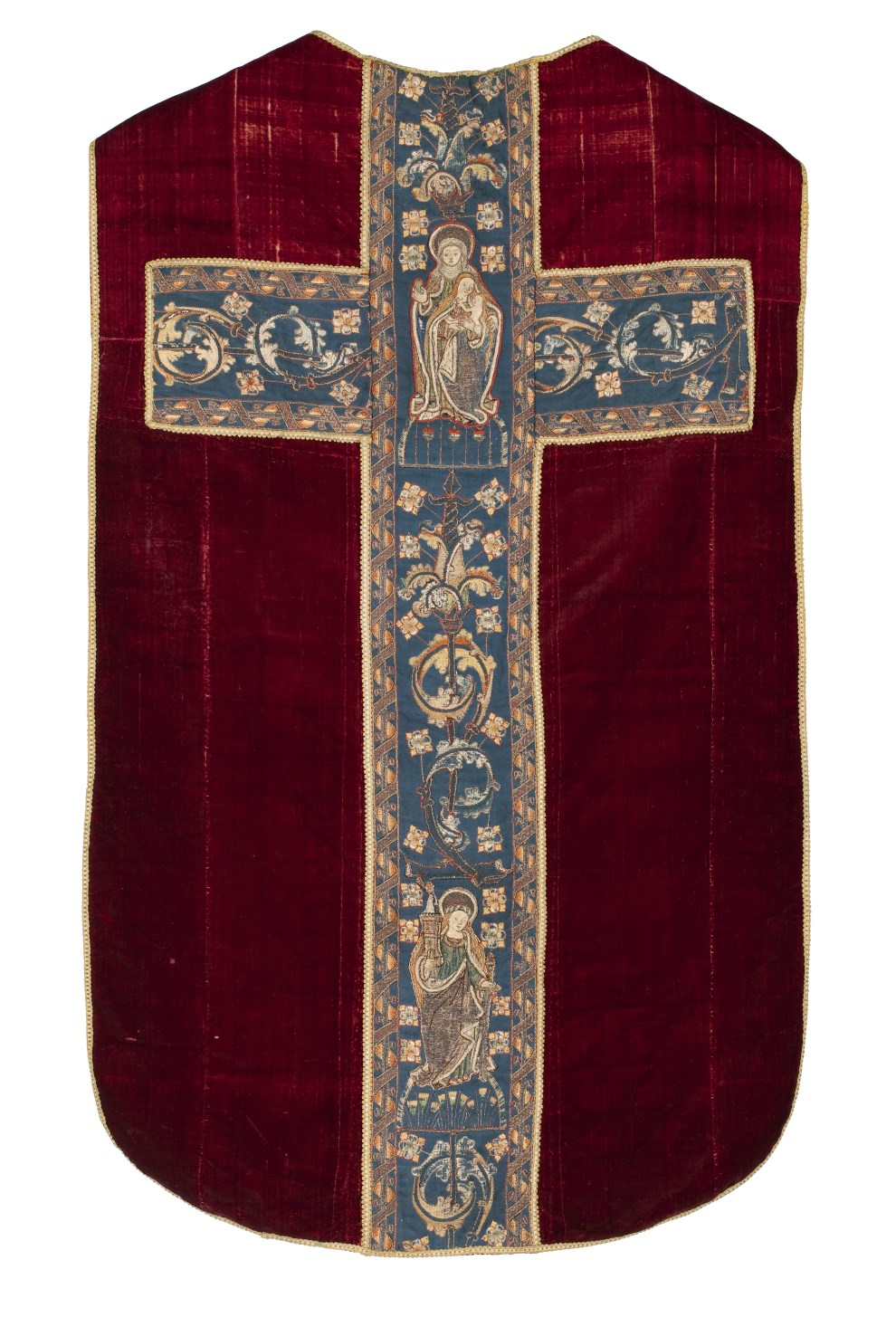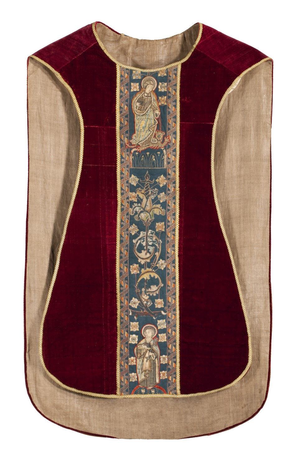 Het kazuifel in vioolvorm is van effen rood zijdefluweel met gesneden pool. De voering is van grijs linnen. Op het op de achterkant geappliceerde blauwe linnen kazuifelkruis zijn met zijde en zilverdraad guirlandes met rankenachtige voluten en bloemen geborduurd. Op de staande kruisbalk zijn tussen de ornamenten heiligen geappliceerd. Bovenaan een Anna te Drieën. Anna ...