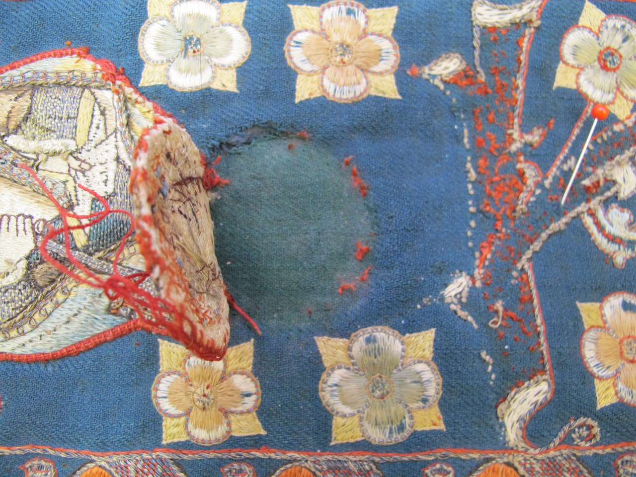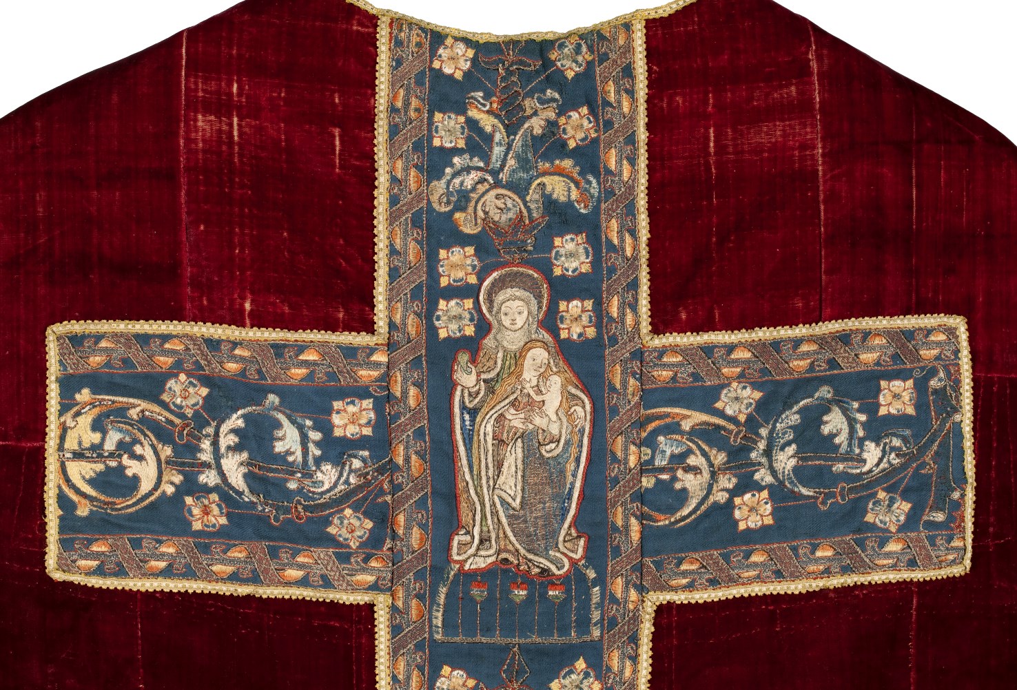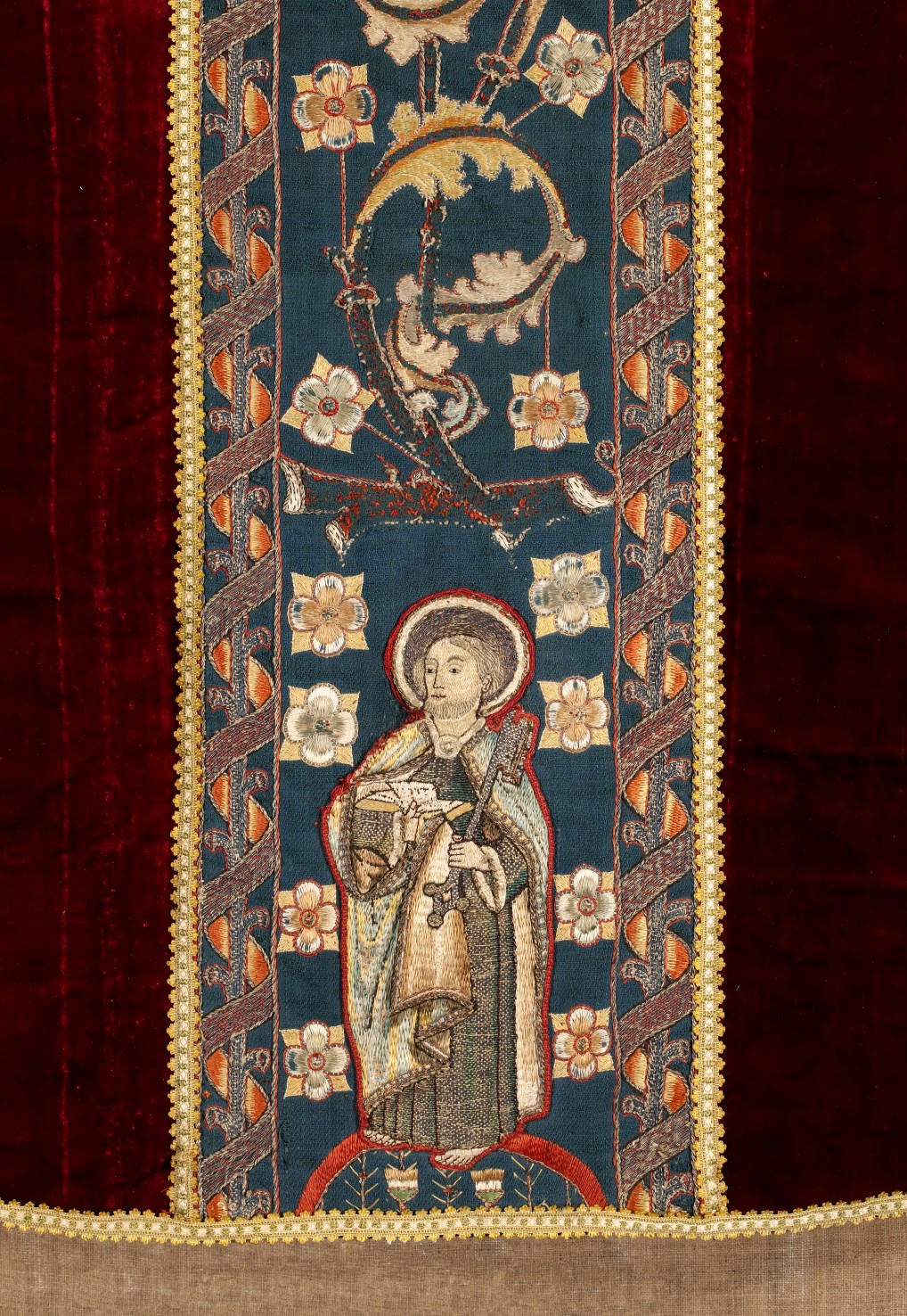 Het kazuifel in vioolvorm is van effen rood zijdefluweel met gesneden pool. De voering is van grijs linnen. Op het op de achterkant geappliceerde blauwe linnen kazuifelkruis zijn met zijde en zilverdraad guirlandes met rankenachtige voluten en bloemen geborduurd. Op de staande kruisbalk zijn tussen de ornamenten heiligen geappliceerd. Bovenaan een Anna te Drieën. Anna ...