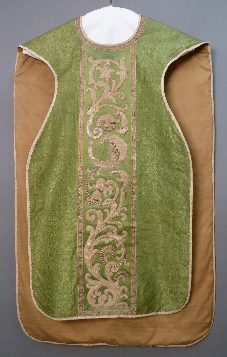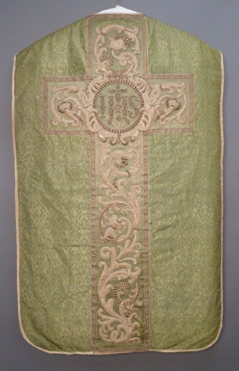 Het kazuifel in vioolvorm is van groene zijden damast, waarin een gestileerd granaatappelpatroon is geweven. Het kazuifelkruis op de achterkant is evenals de kolom van lichtgroene zijdezonder patroon. De aanhechting werd weggewerkt met een rand galon. waarop opgehoogde ranken en lofwerk van witte zijde en gelegd gouddraad in relief zijn geappliceerd. In het midden een ...
