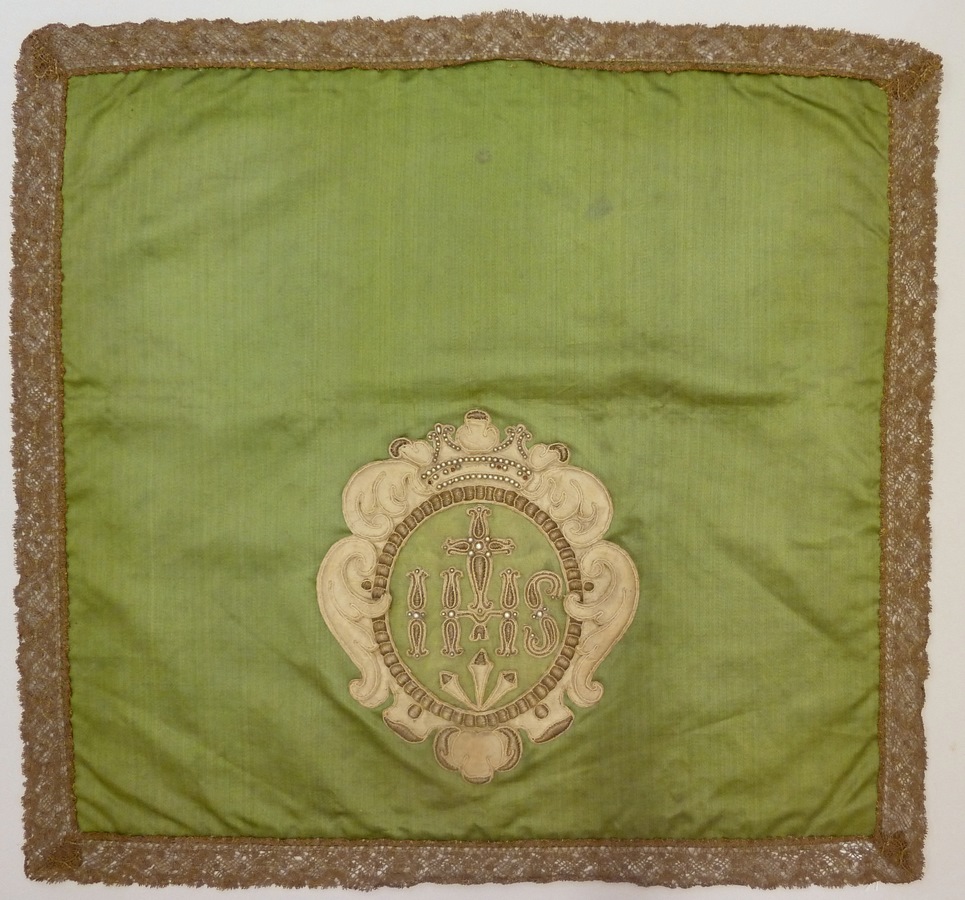 Groen kelkvelum met cartouche van rinceaux en I.H.S.