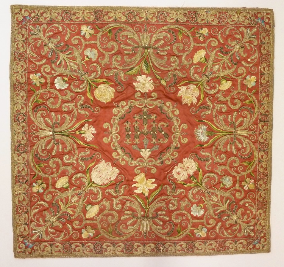 Rood kelkvelum met I.H.S., waaronder geel hart in krans omgeven door rinceaux