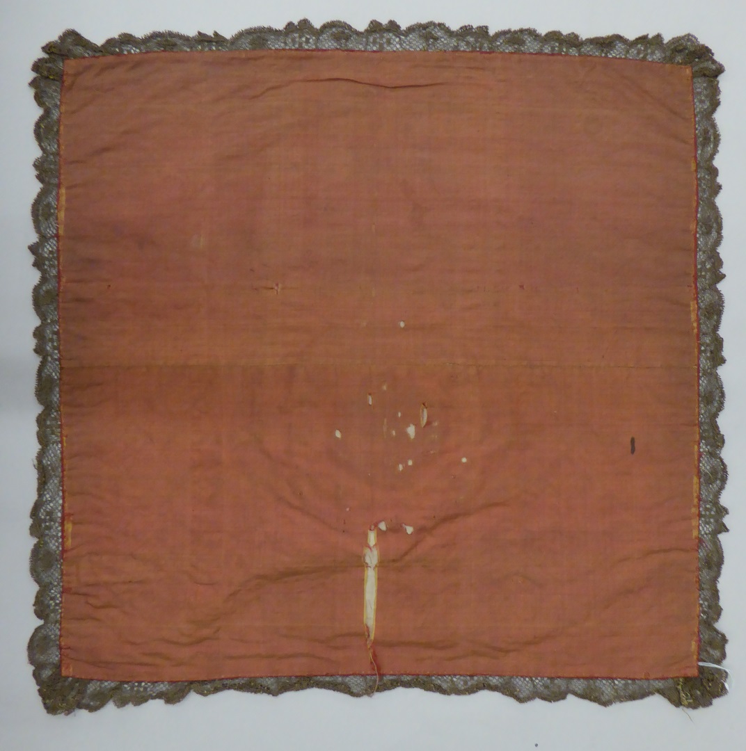 Rood kelkvelum met ingeweven bloempatroon met I.H.S. boven cartouche
