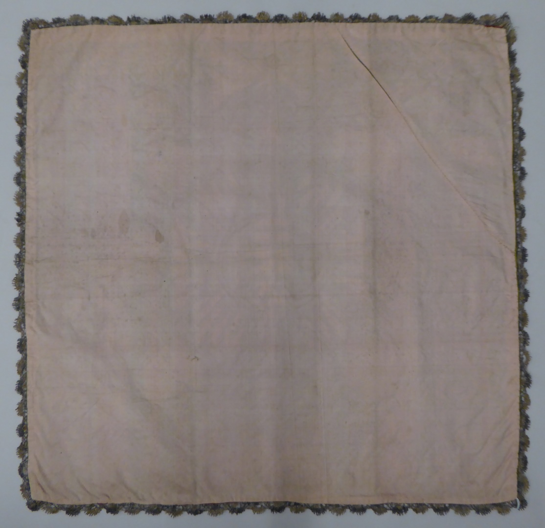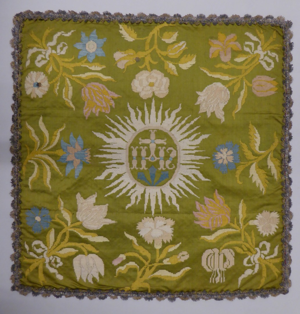 Groen kelkvelum met I.H.S., ingeweven in stralenkrans omgeven door bloemenrand