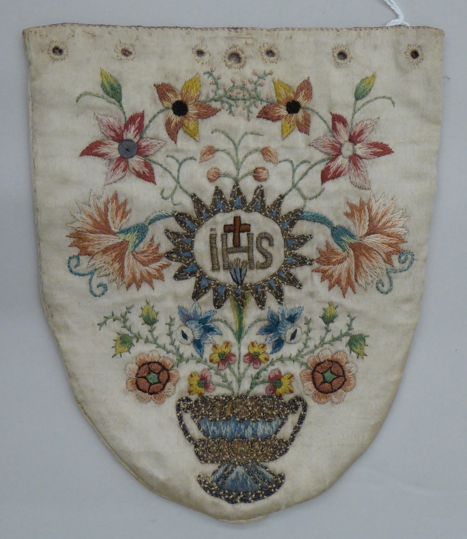 Witte ziekenbeurs met I.H.S. in tuil met bloemen in vaas