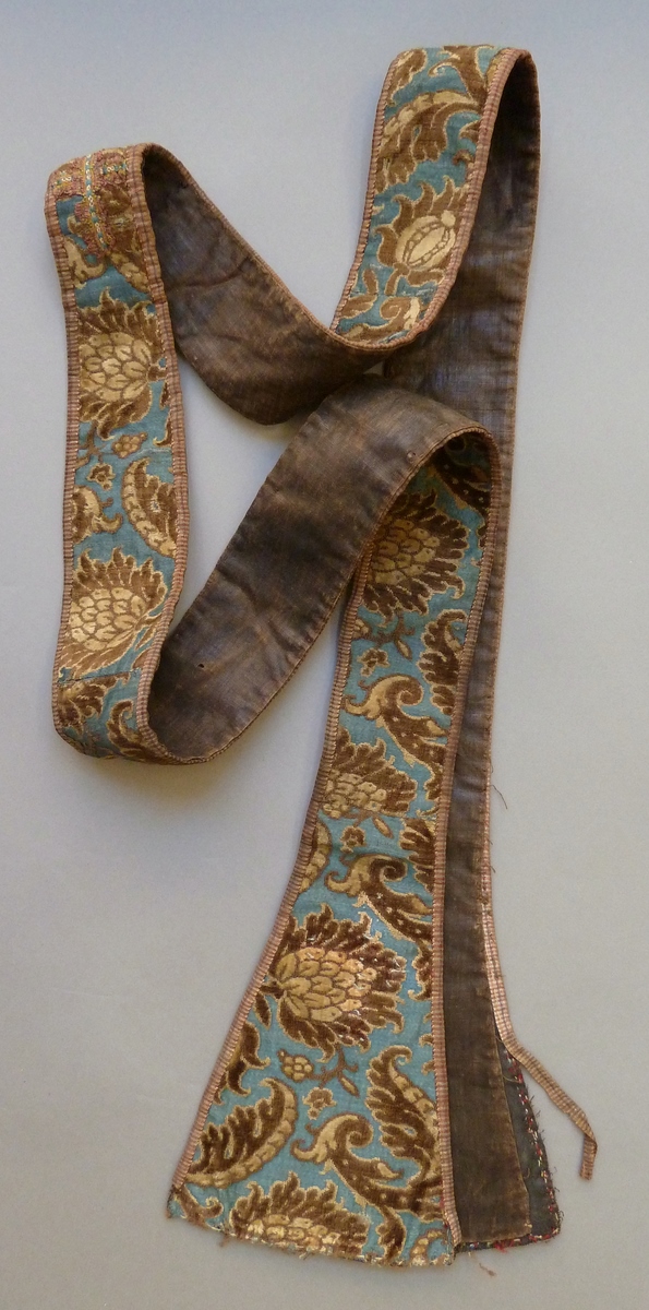 Blauwe stola van geciseleerd fluweel met bruine lotusranken