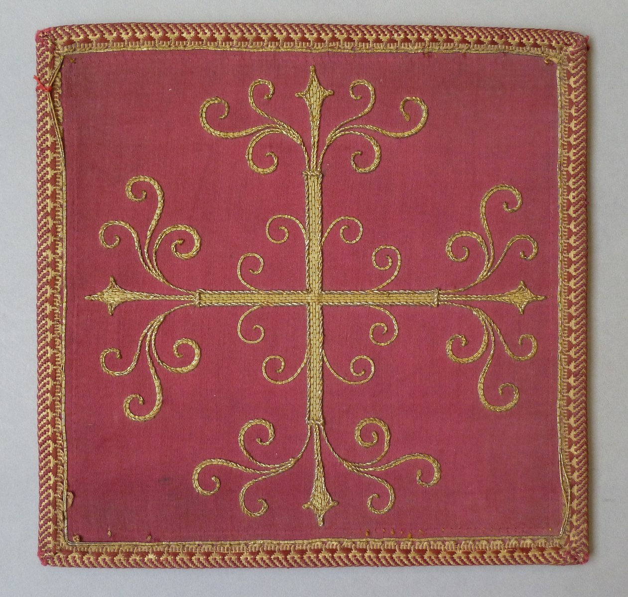 De pallabestaat uit een houten plaatje, waarover aan de voorkant rode zijde in satijnbinding is gespannen. Op de zijde is met goudbouillondraad in de contouren een kruis geborduurd, opgevuld met gouddraad. Aan de uiteinden der kruisarmen zijn ranken aangebracht. De achterkant van de palla is bekleed met gele damast. Techniek: in het kruis gelegd gouddraad, ...