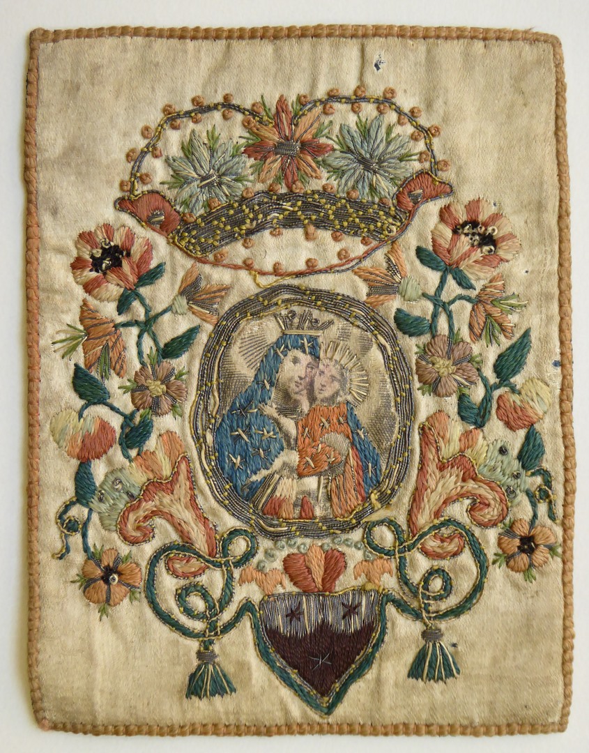 Scapulier met O.L.V. van de Karmel in gekroond medaillon met bloemranken