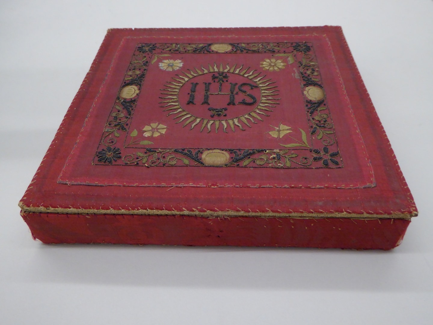 Rode palladoos met I.H.S. in stralenkrans gevat in rinceaux en bloemen