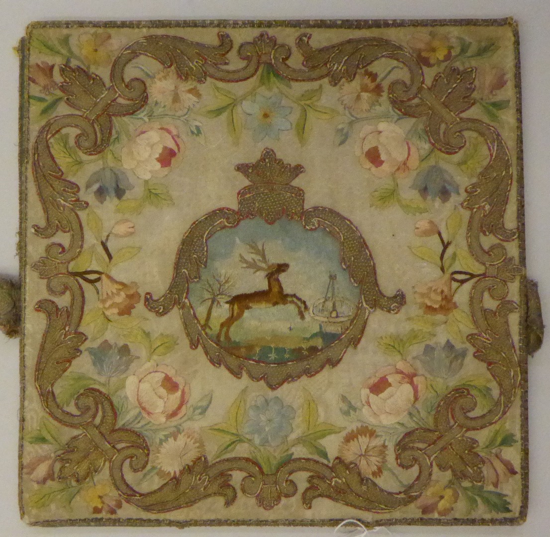 Op de deksel van de bursa van witte zijdedamast is in een cartouche een hert afgebeeld, dat in een weidelandschap naar een bron snelt om zijn dorst te lessen. Rond de scène is een rand van bloemen en ranken geborduurd (rozen, anjers en korenbloemen). Over de rand heen is lofwerk aangebracht. De voering is van ...