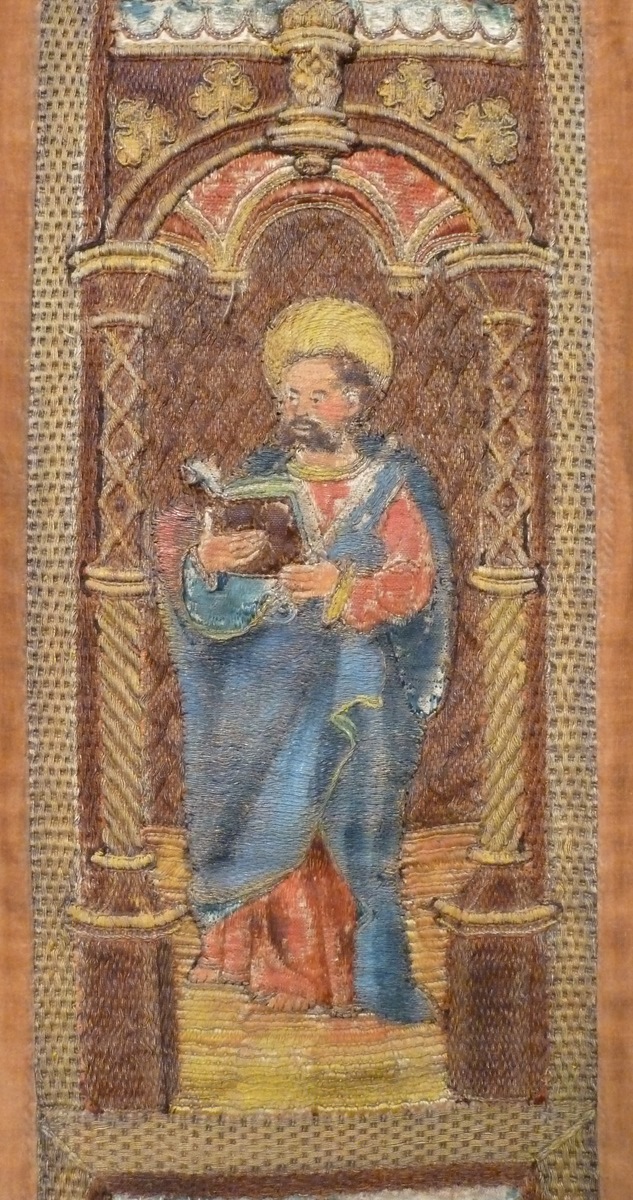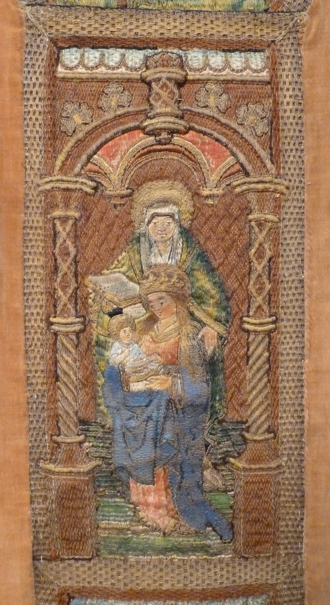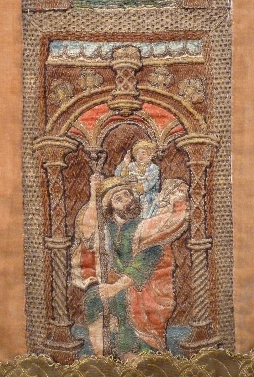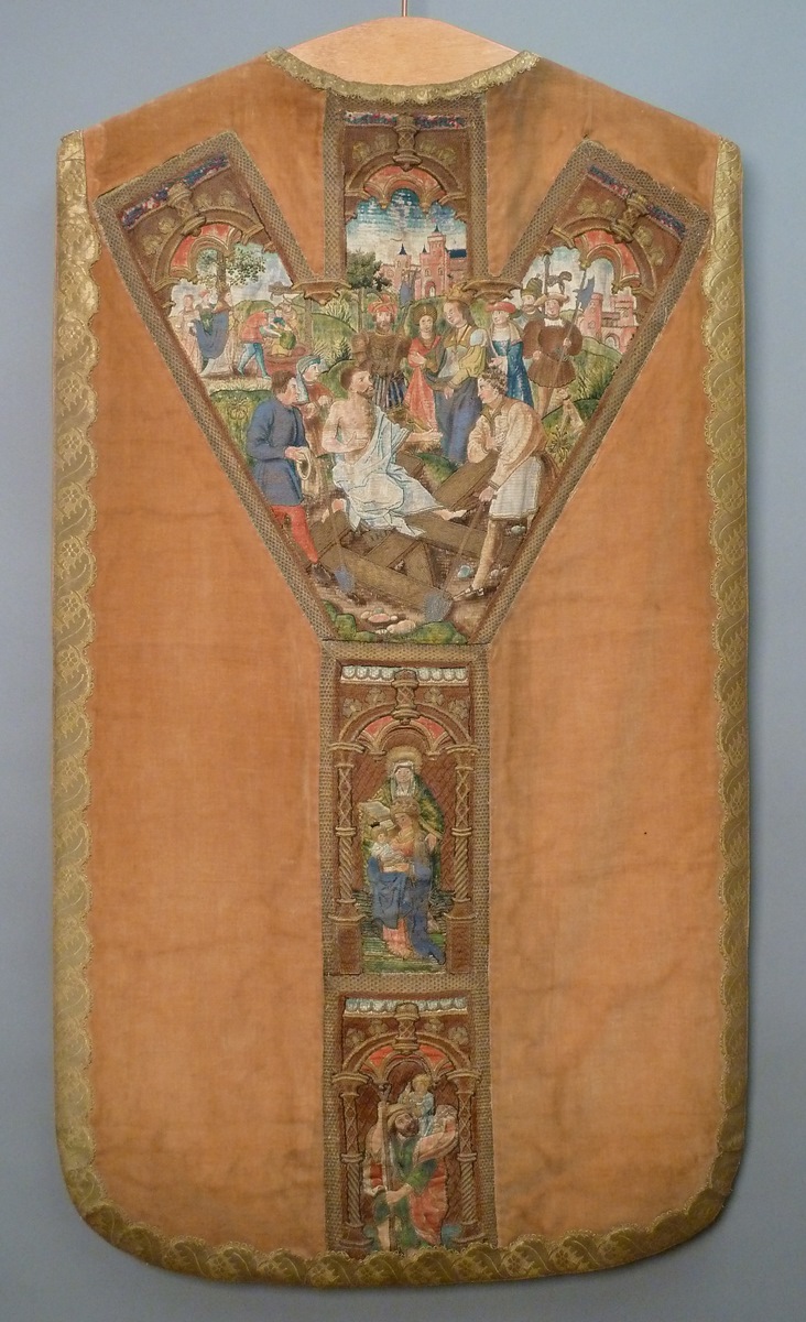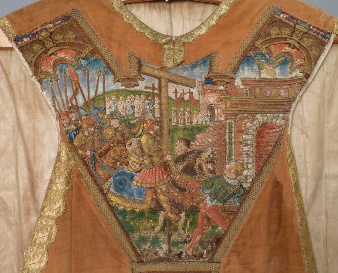 Het verbleekt rood fluwelen kazuifel heeft een vioolvorm en is omzoomd door 19de eeuws goudgalon. Voor- en achterzijde zijn versierd met een geborduurd gaffelkruis waaronder enkele aurifriezen. De voering is van ongebleekt linnen. Het kazuifel is omzoomd met 19de-eeuws goudgalon. Aan de achterzijde wordt onder drie baldakijnen met elk een middentorentje tussen kruisbloemen de ontdekking ...