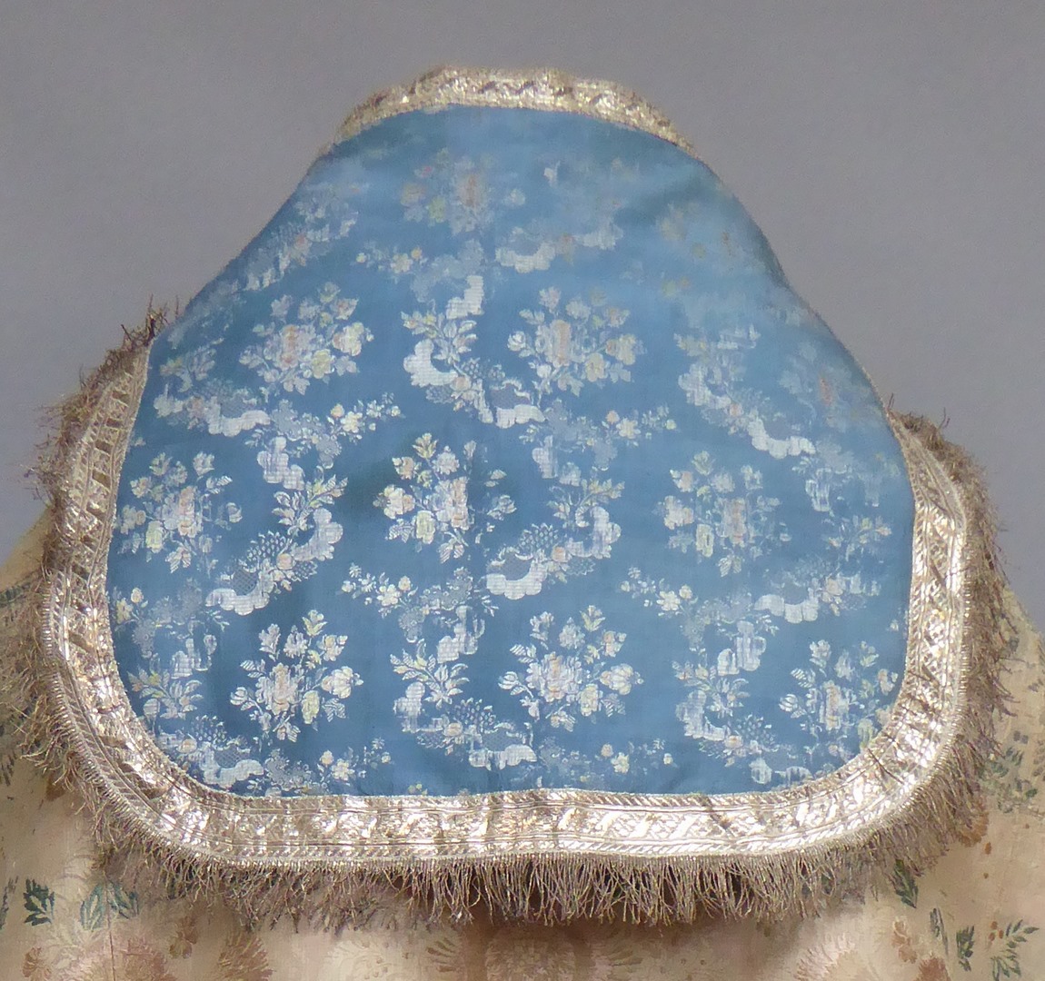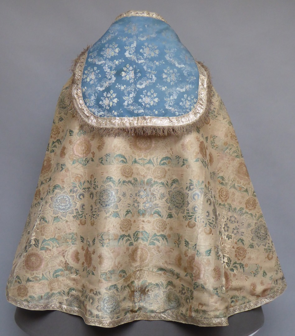 Witte koorkap van zilverbrokaat met bloem- en bladpatroon