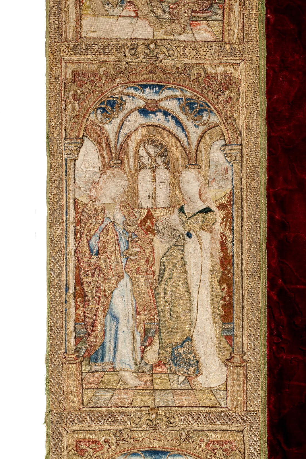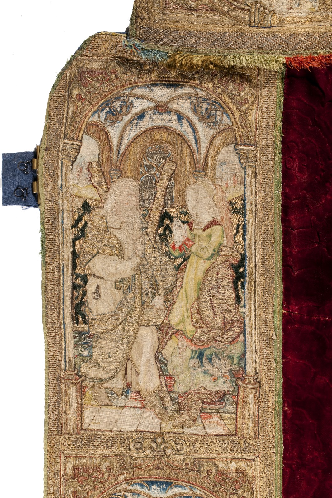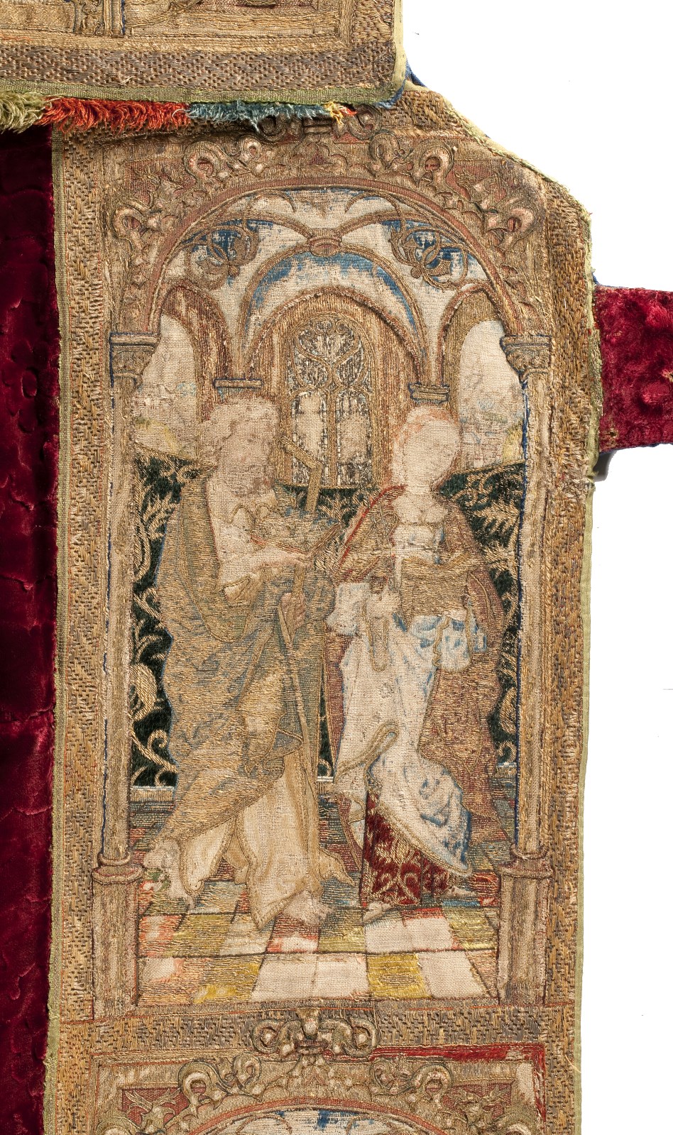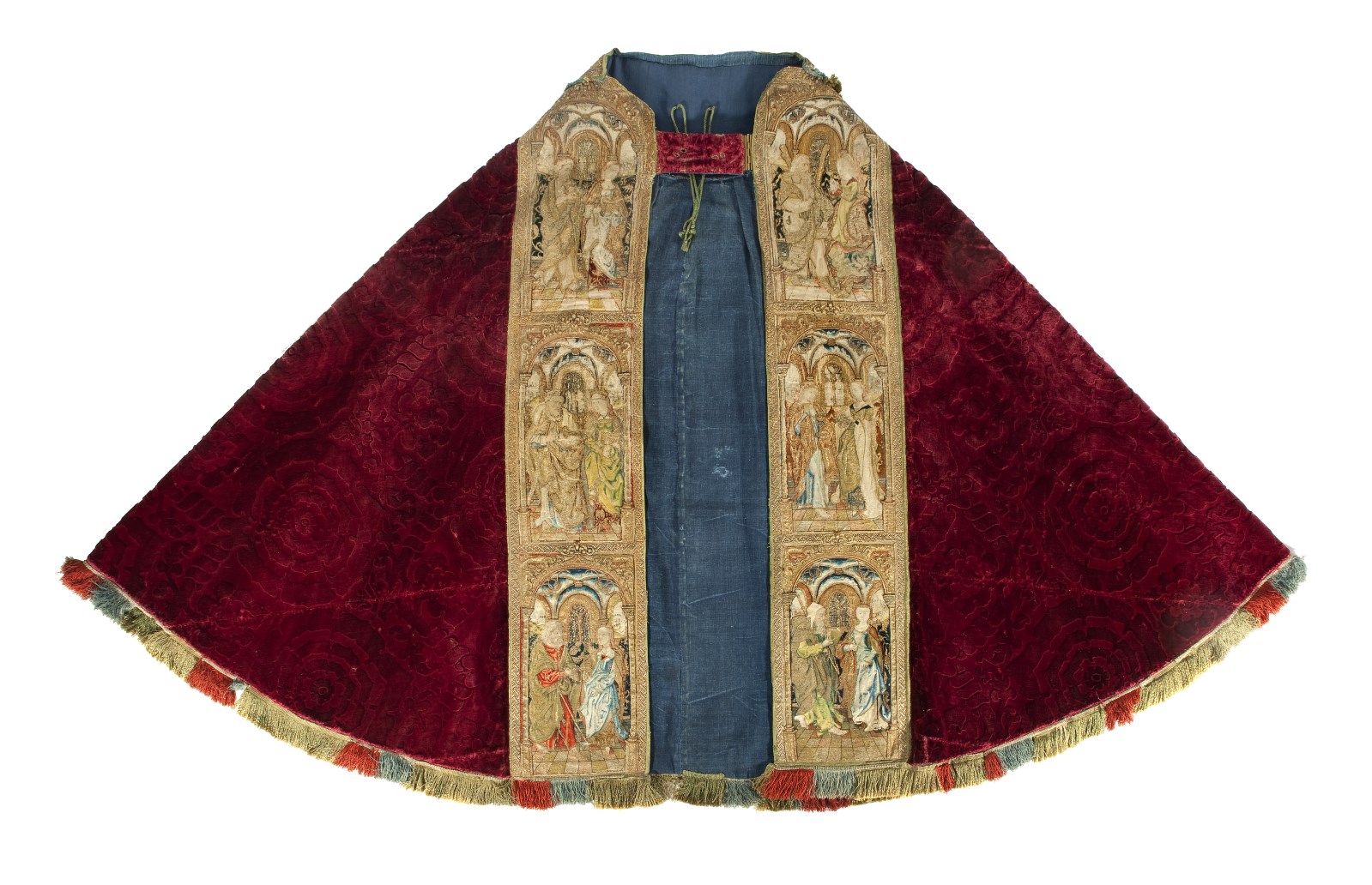 Rode koorkap van geciseleerde Venetiaans fluweel met dood van Maria
