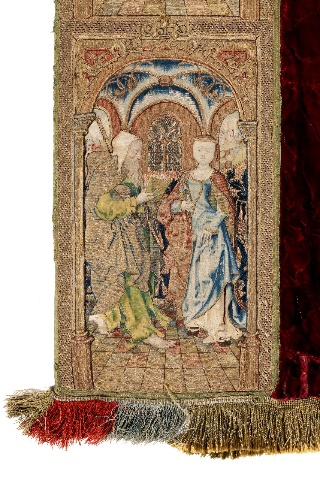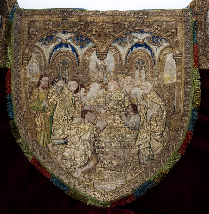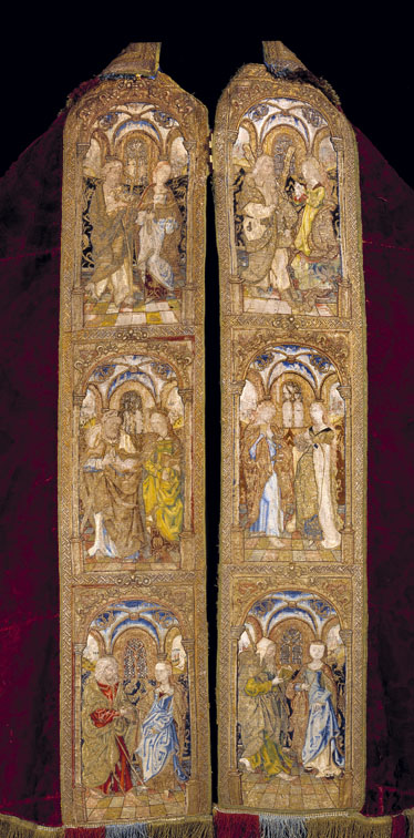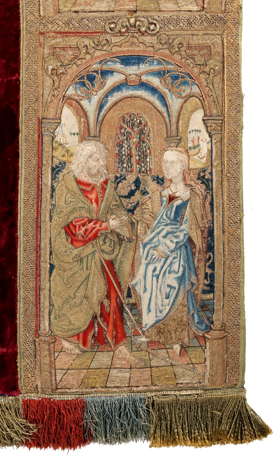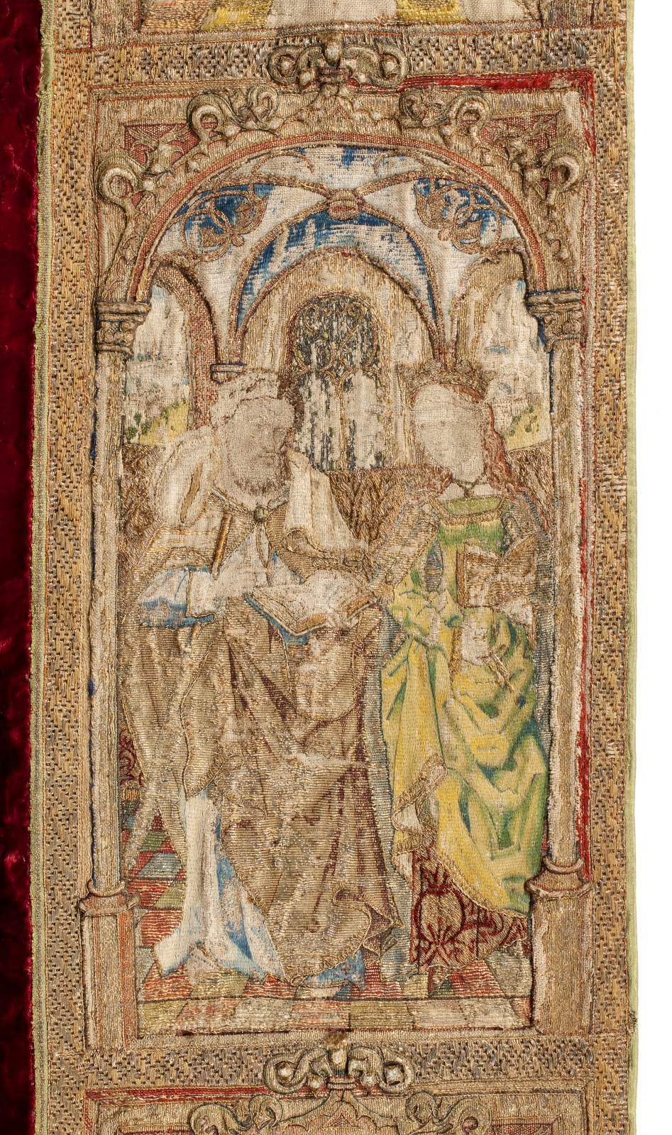 Rode koorkap van geciseleerde Venetiaans fluweel met dood van Maria