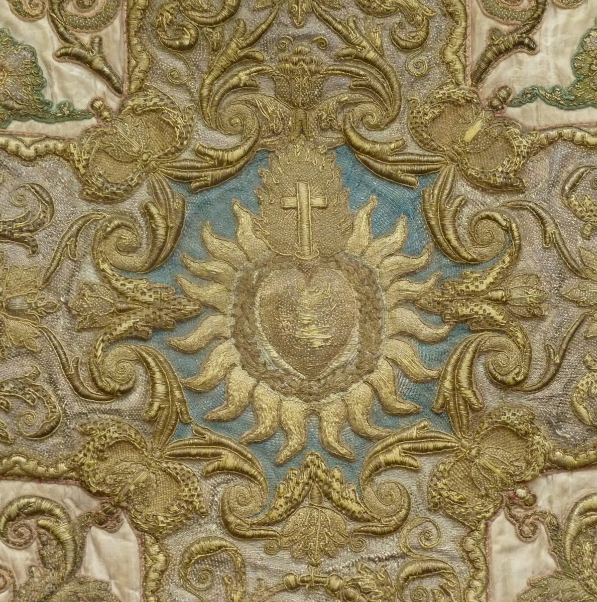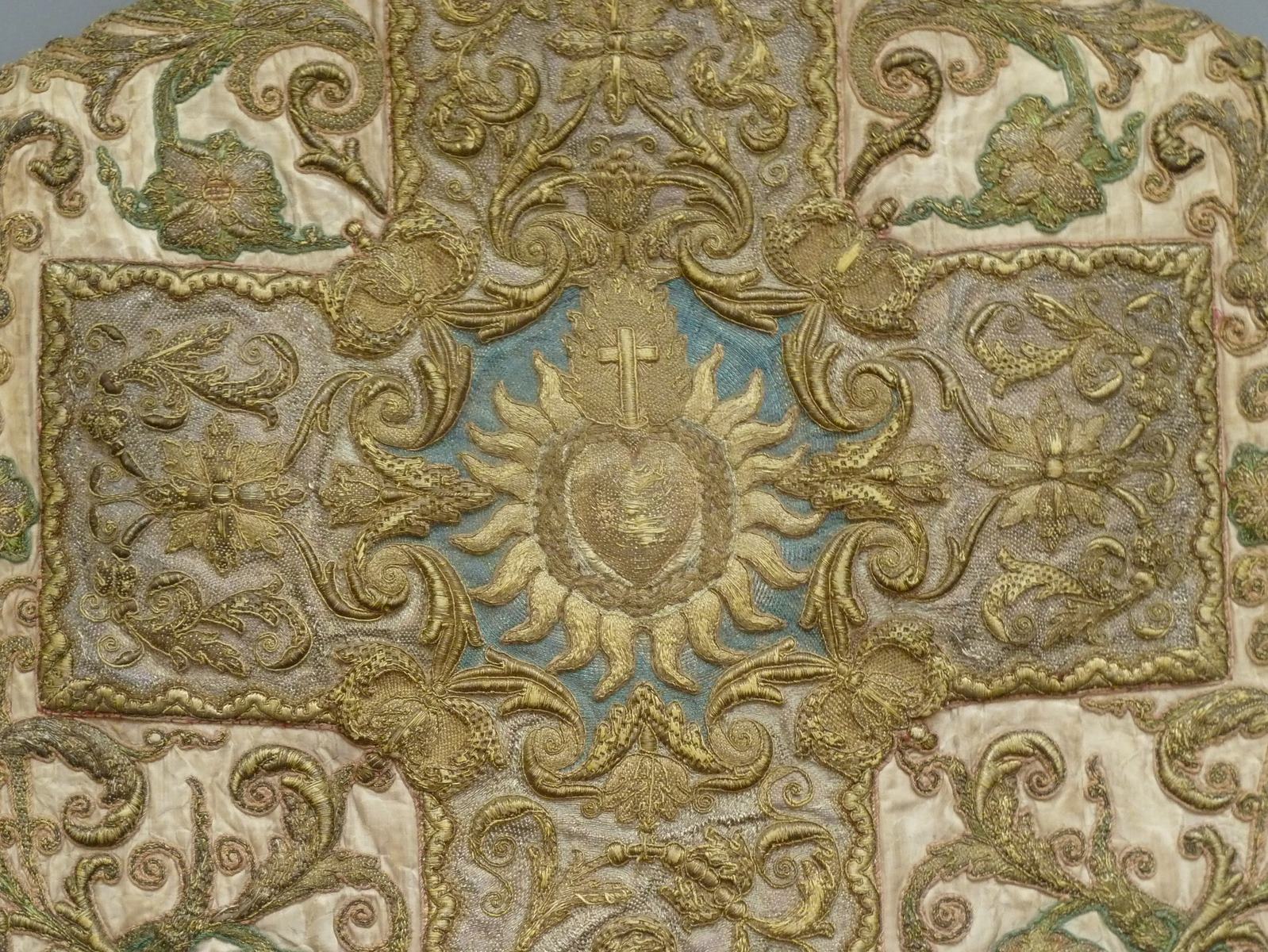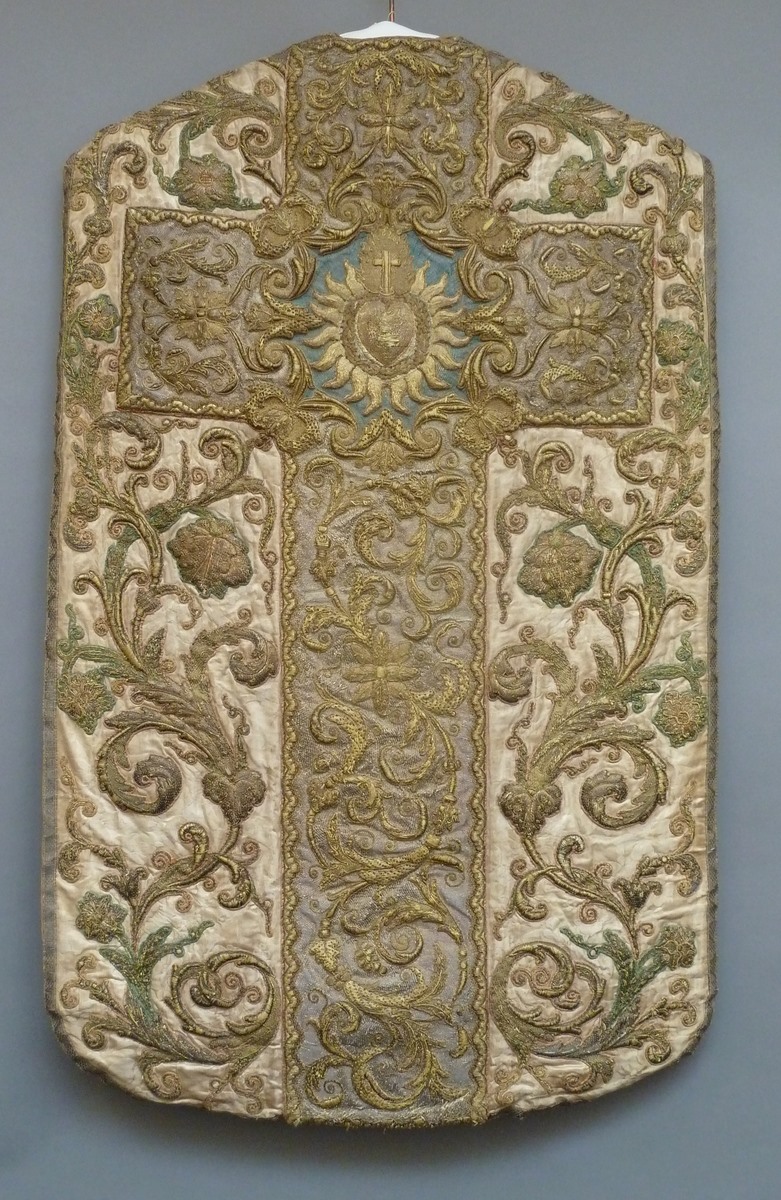 Wit kazuifel met rankenpatroon en kruis met hart in doornenkroon en stralenkrans