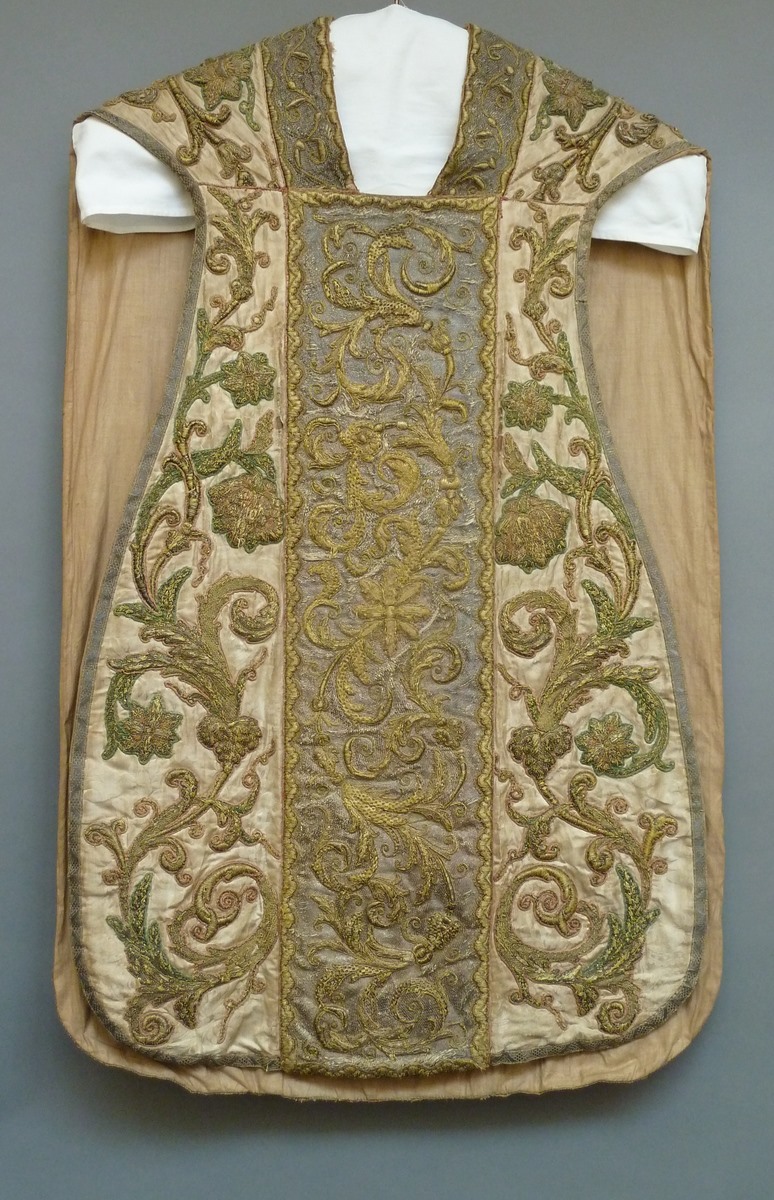 Het kazuifel in vioolvorm draagt op een ondergrond van zware, witte zijden damast hetzelfde rankenpatroon als de bijbehorende koorkap ABM t2094a. Ook de ornamentiek op het kazuifelkruis aan de achterkant en de kolom aan de voorkant is gelijk aan die der banden van de koorkap. Centraal op de achterkant staat in het kazuifelkruis binnen een ...
