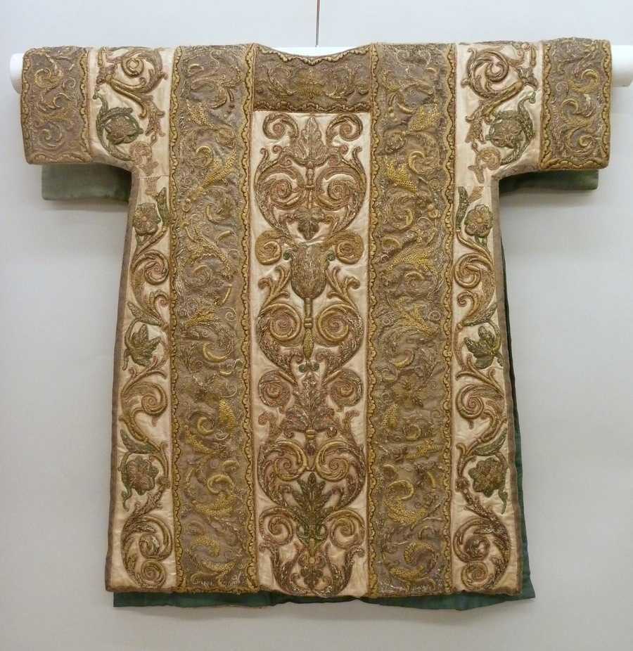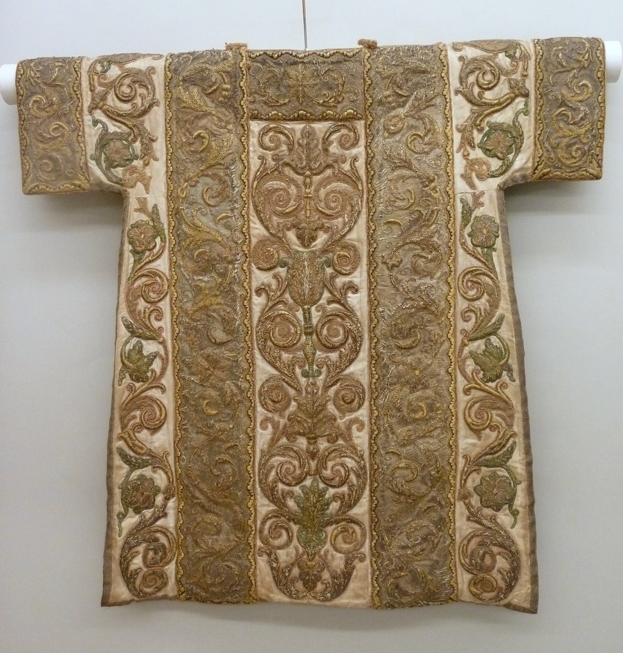 Witte dalmatiek met rankenornament met banden van goudborduursel in reliëf op een zilveren fond