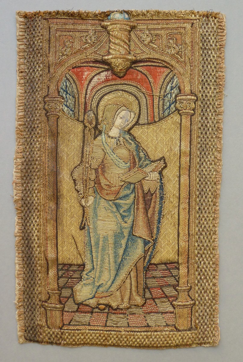 In eenzelfde architecturale ambiance als ABM t2107a wordt staande op een tegelvloertje de H. Apollonia afgebeeld. Zij draagt dezelfde kleding en hoofdtooi als de H. Ursula (ABM t2107b), zij het in iets afwijkende kleuren. In de linkerhand draagt zij een boek, in de rechterhand haar attribuut, de tang waarin een tand beklemd zit. Techniek: zie ...