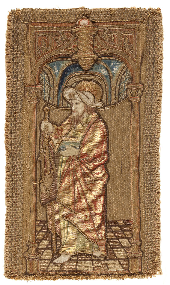 Op het borduurwerk wordt in eenzelfde architecturale ambiance als ABM t2107a op een tegelvloertje de apostel Jacobus de Meerdere afgebeeld. Hij gaat gekleed in een onderkleed met kraag en een met gouddraad afgebiesde mantel. Op het hoofd draagt hij de breedgerande pelgrimshoed, aan de voorzijde voorzien van de Jacobsschelp, zijn attribuut. In de rechterhand houdt ...
