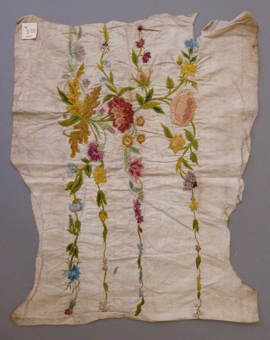 Borduurwerk op witte keper afkomstig van lijfje met bloemslinger