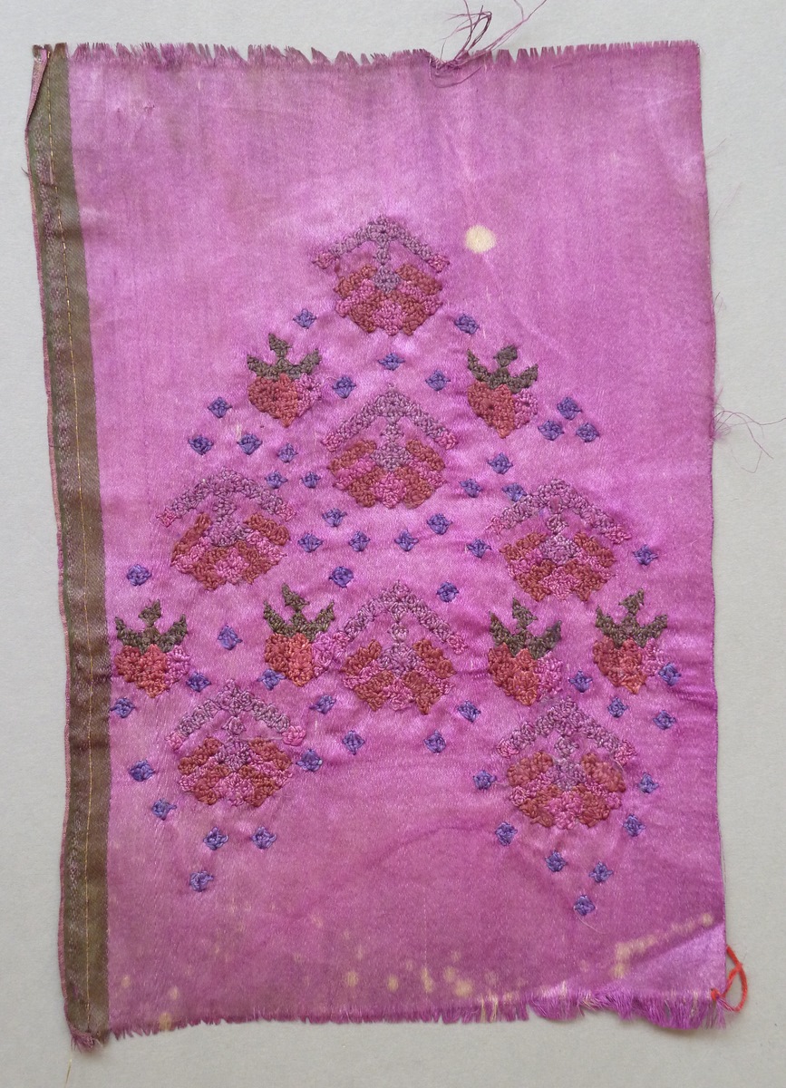 Borduursel op paarse satijn met bloemen