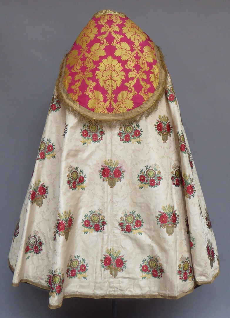 Witte koorkap met ingeweven rankenpatroon, boeketten en vazen