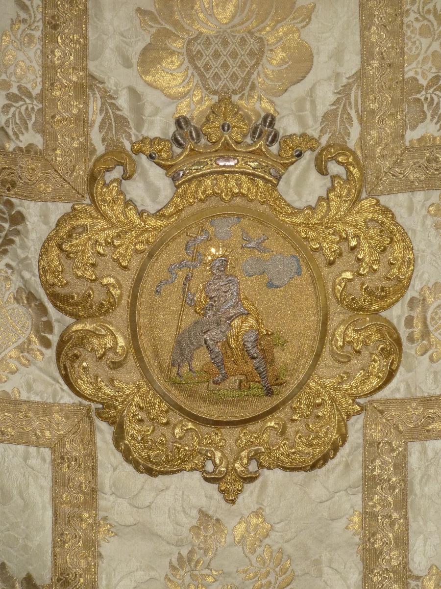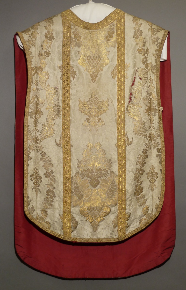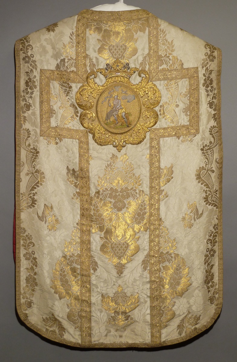Wit kazuifel van goudbrokaat met ingeweven bloempatroon met Johannes de Doper in medaillon