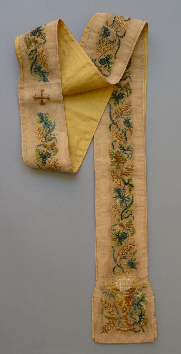 Stola van stramiengaas met in petit point slinger van wijnranken en aan uiteinden kelk met hostie