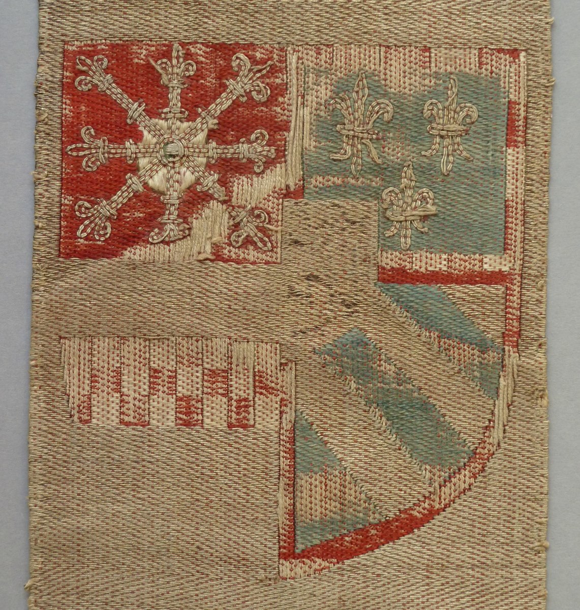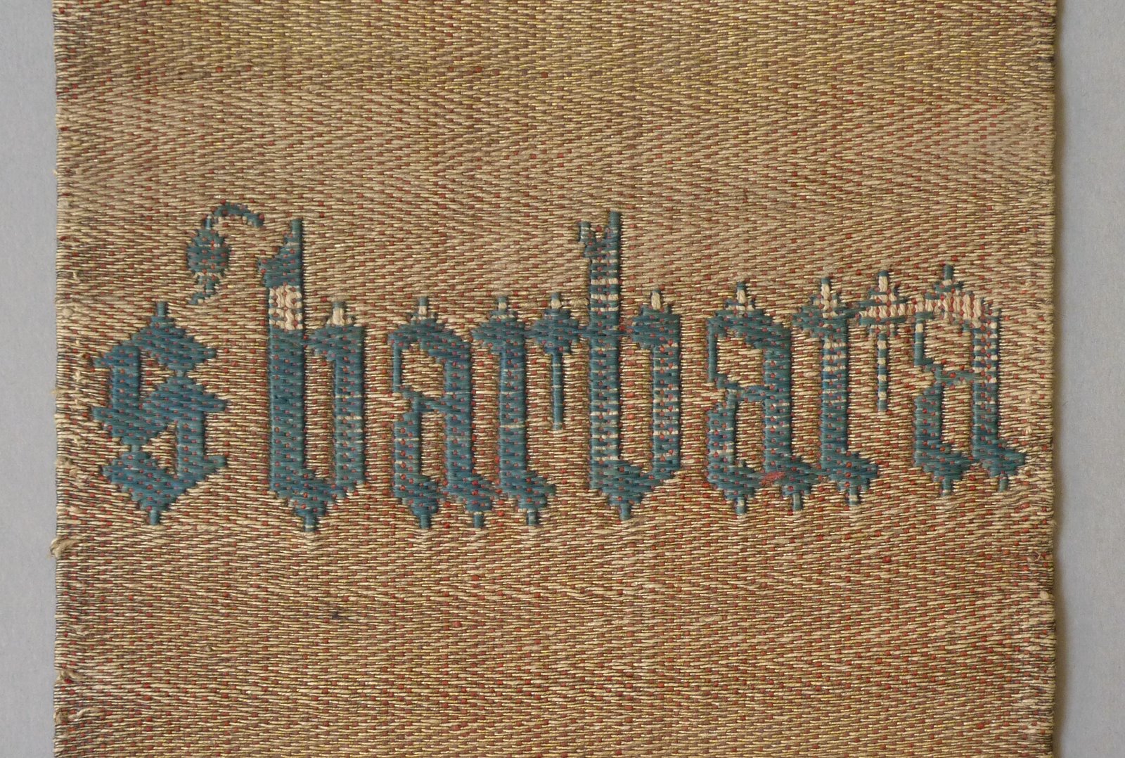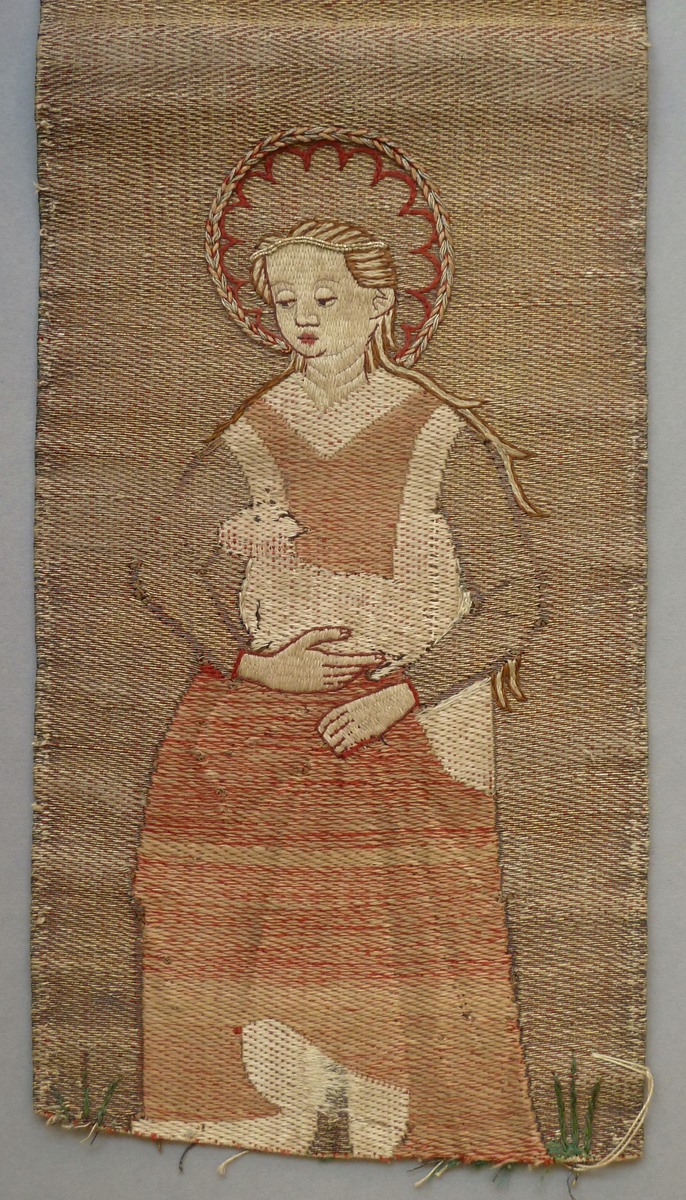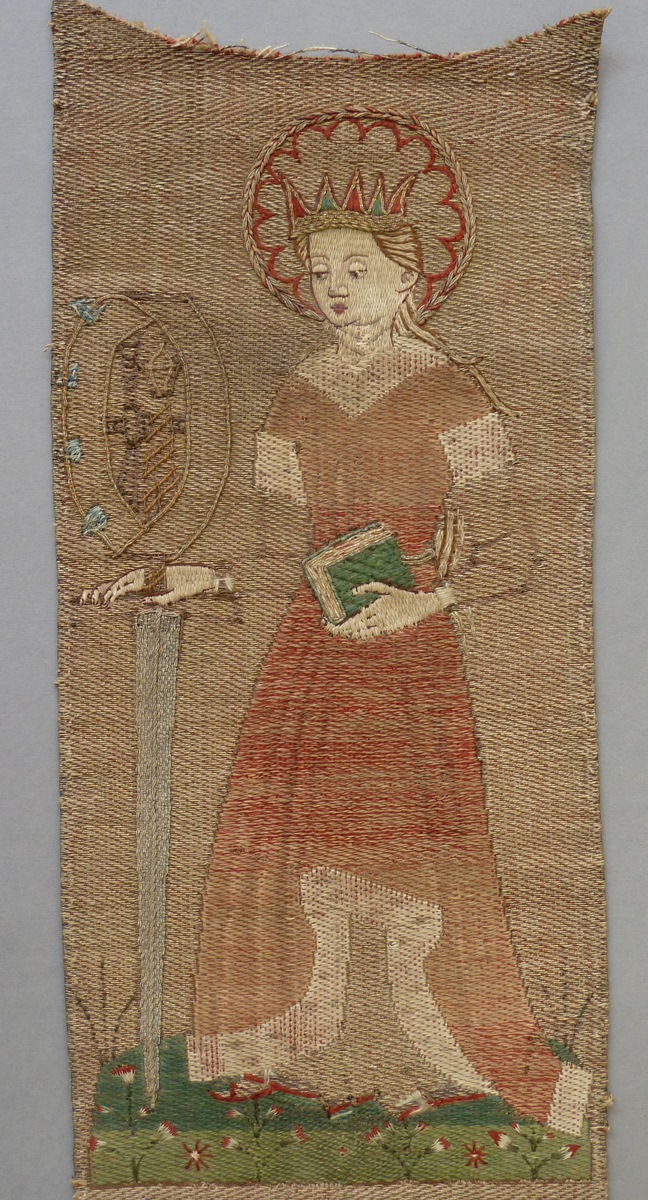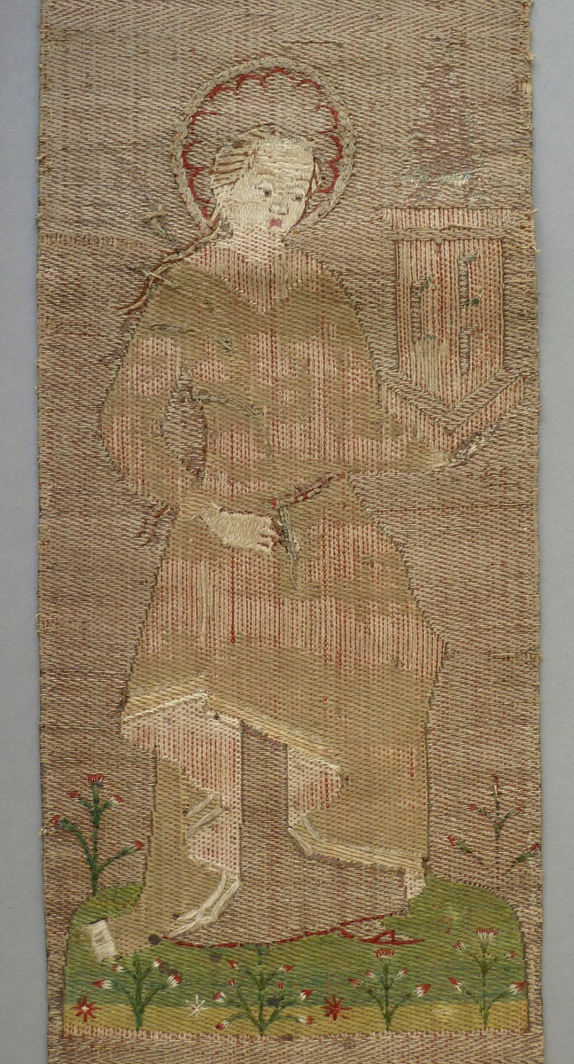 De smalle geweven en aan de onderkant versneden kolom diende als versiering van de achterijde van een kazuifel. Van boven naar beneden worden op een grasveld drie vrouwelijke heiligen in eigentijdse gewaden afgebeeld met hun attributen: Catharina met rad en zwaard in de rechterhand. In de linkerhand draagt ze een gesloten boek. Daaronder Barbara met ...