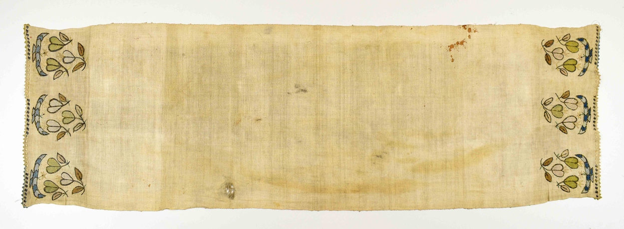 Wit lessenaarskleed geborduurd met vruchten in schalen