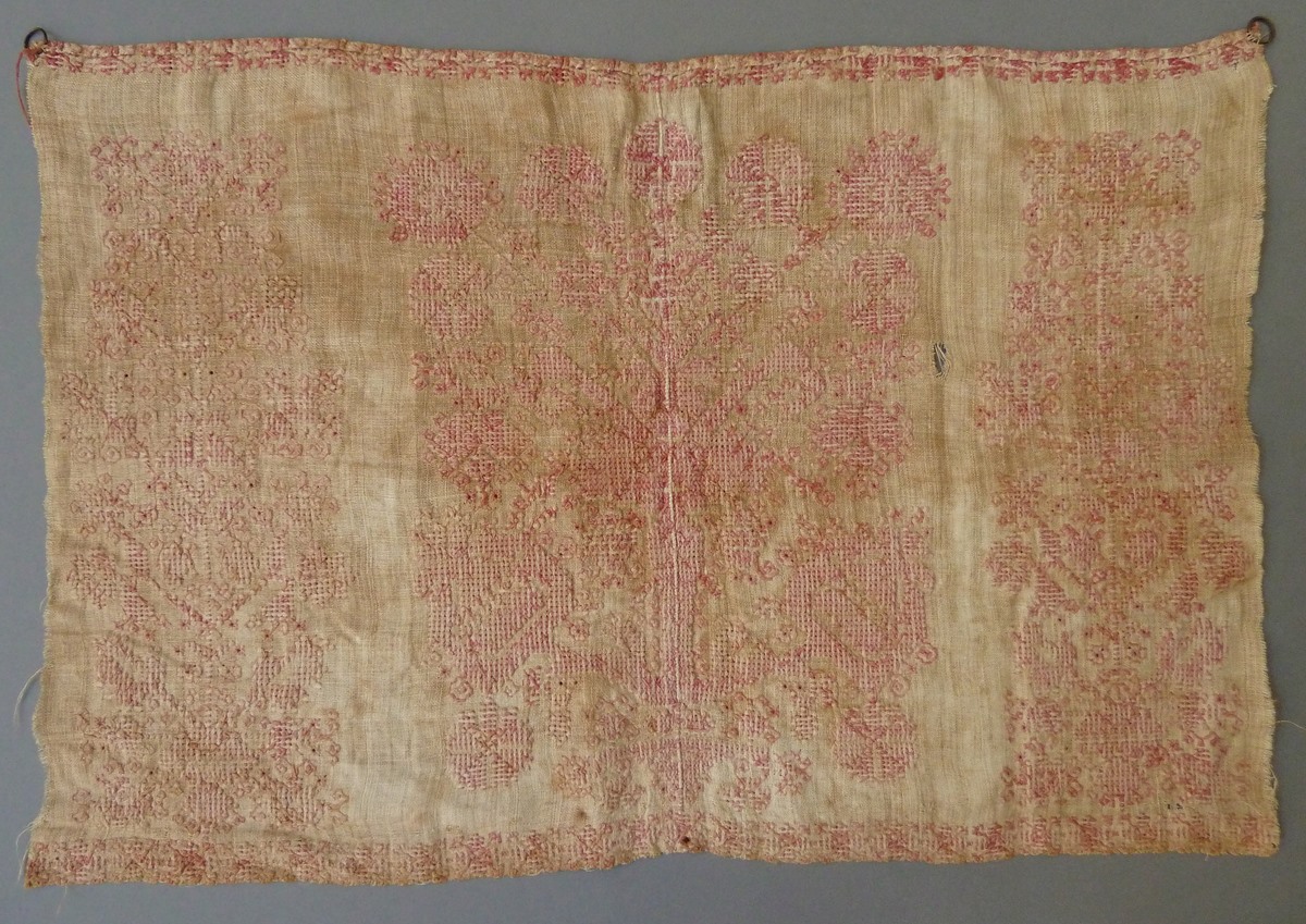 Wit linnen borduursel met gestyleerd boeket geflankeerd door empire vazen met gebroken hartjes