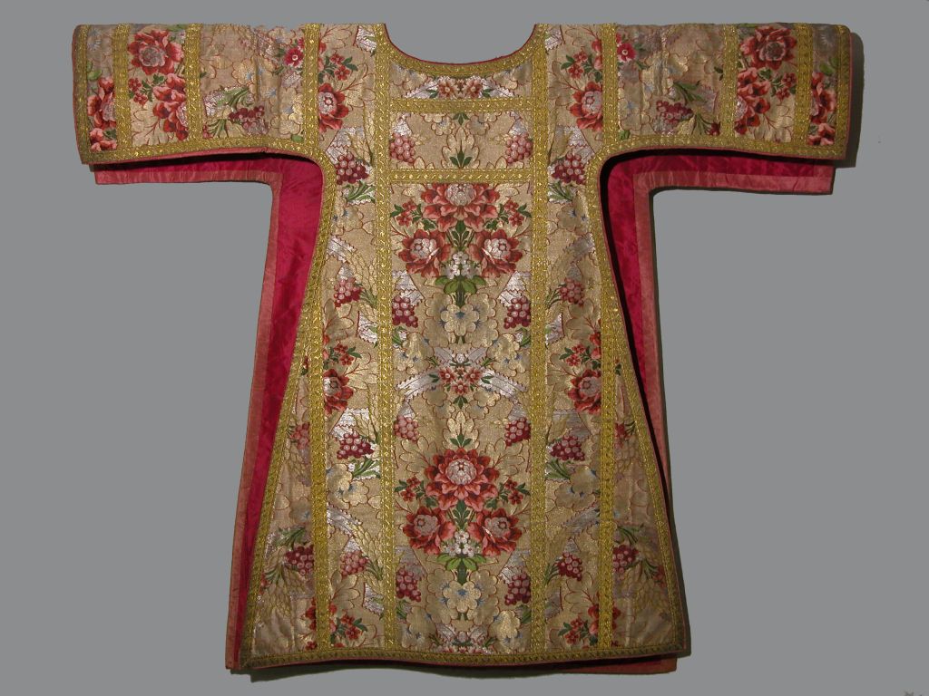 Goudkleurige dalmatiek van zijdebrokaat met ingeweven patroon van boeketten in zilveren band